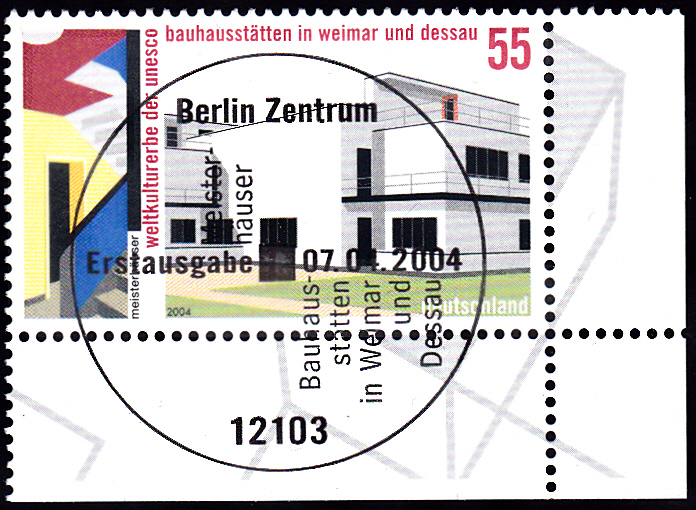 Bei der Deutschen Post ist bereits 2004 eine Marke (MiNr 2394) in der Serie "UNESCO-Welterbe Bauhausstätten in Weimar und Dessau" mit Meisterhäuser aus Dessau. Hier zeige ich eine Marke vom Eckrand.