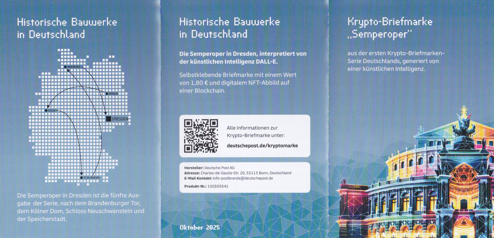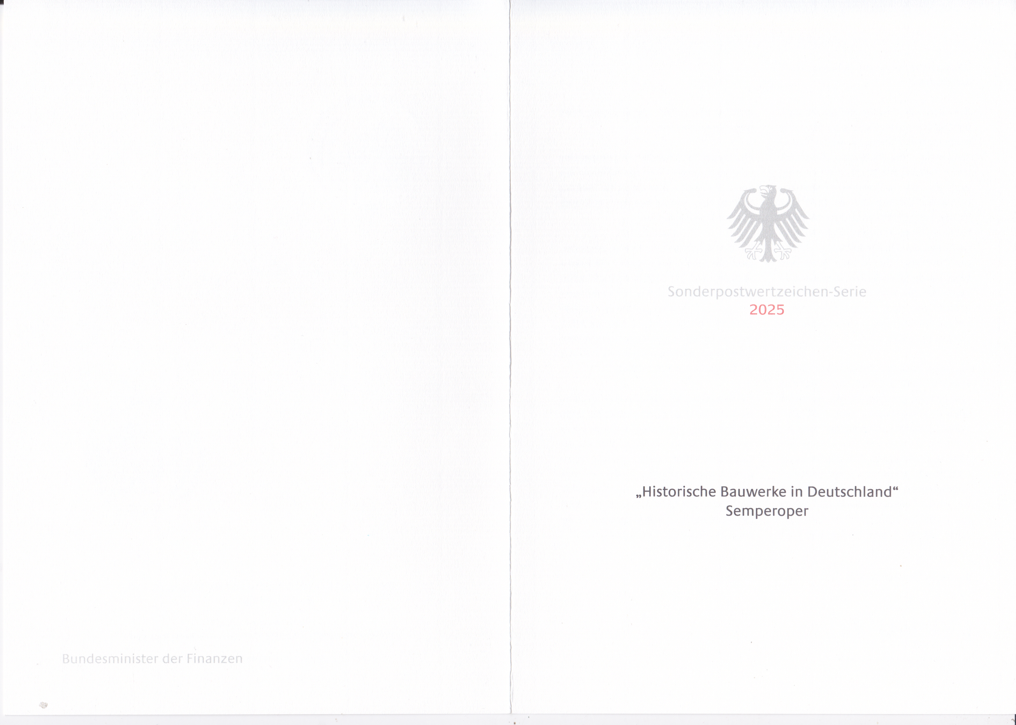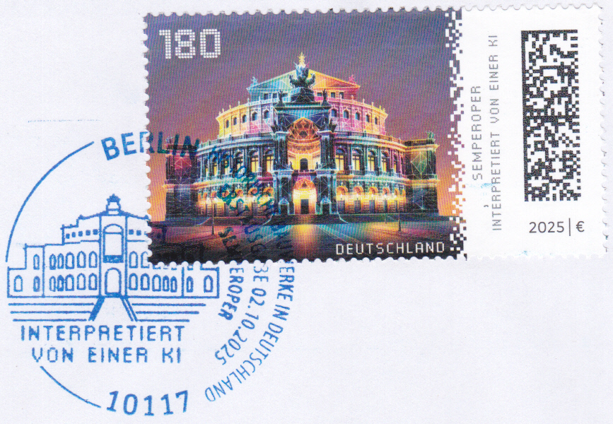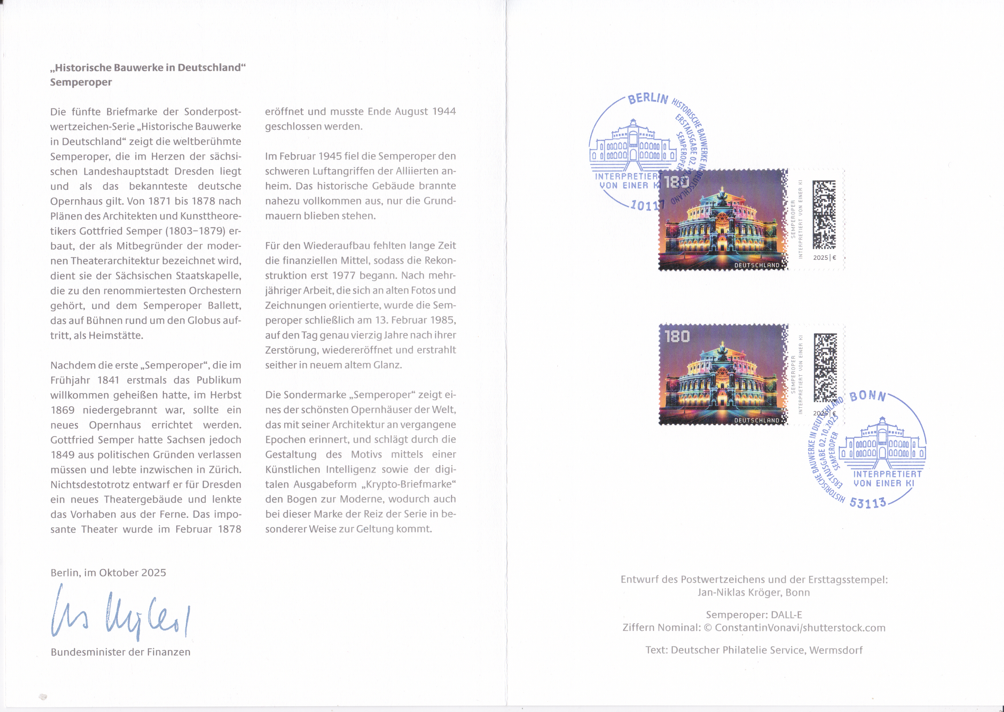 Ministerkarte des Bundesministers für Finanzen mit zwei Marken aus der Serie "Historische Bauwerke in Deutschland" mit dem Motiv "Semperoper, Dresden" (MiNr 3930) mit den beiden Ersttagsonderstempel Bonn und Berlin.