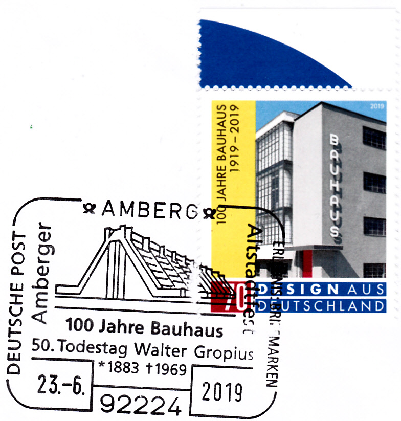 Am 23.6.2019 wurde beim Amberger Altstadtfest ein Sonderstempel passend zu "100 Jahre Bauhaus" eingesetzt. Im Stempelbild wird das Glaswerk in Amberg gezeigt.