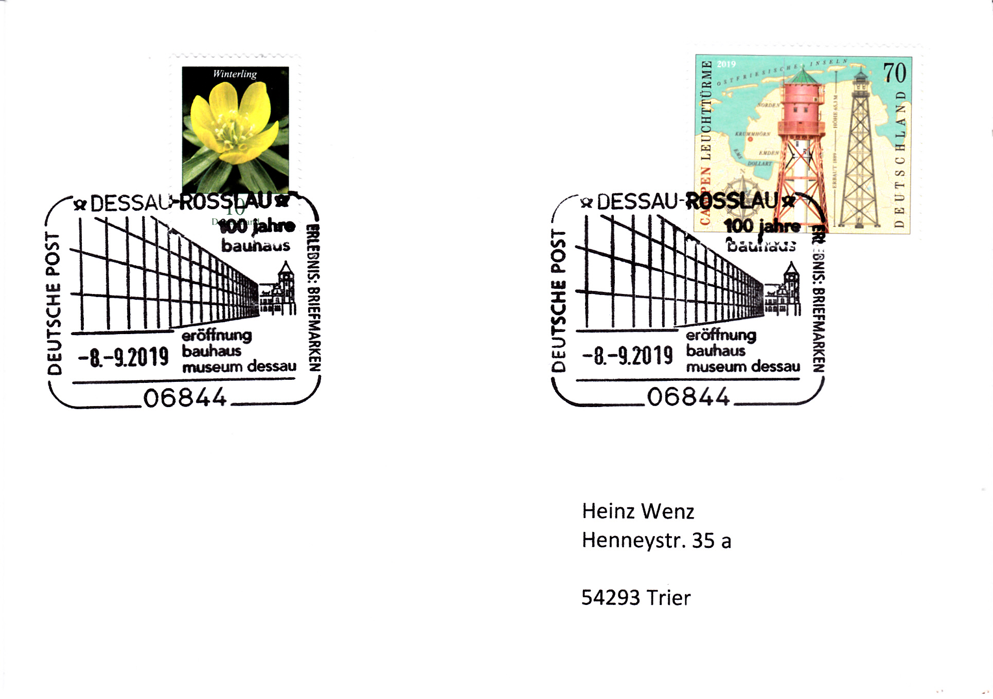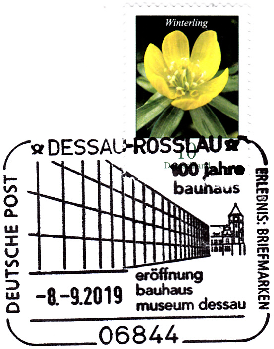 Im Sonderstempel aus Dessau-Rosslau vom 8.9.2019 zur Eröffnung des Bauhaus Museum Dessau werden das Bauhaus Museum Dessau und im Hintergrund das alte Dessauer Hauptpostgebäude gezeigt.