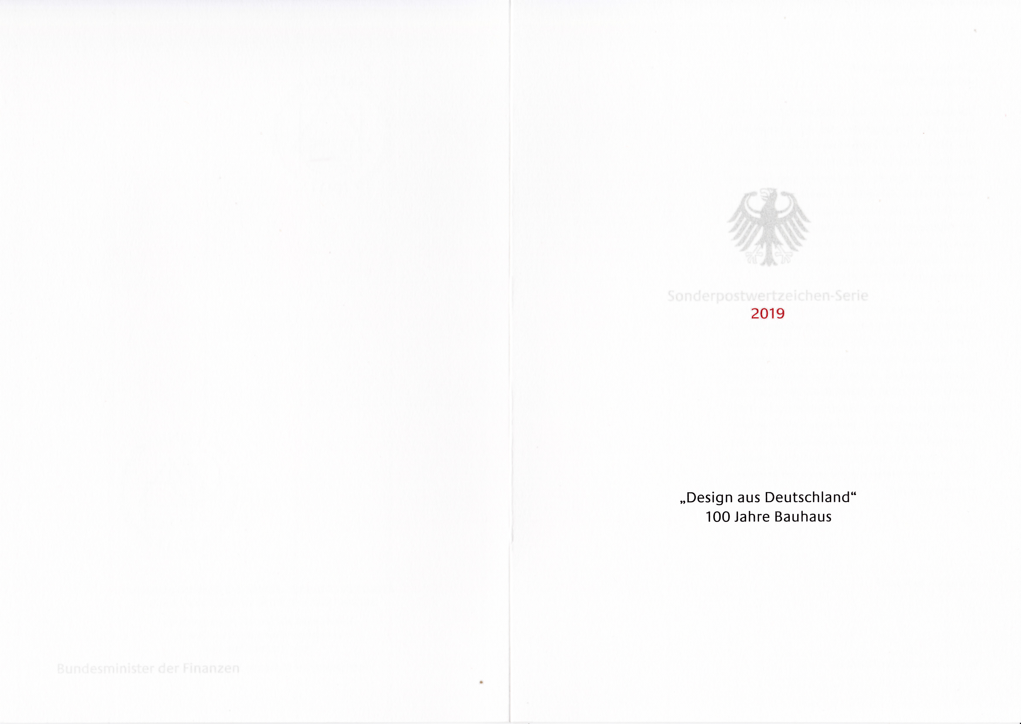 Ministerkarte des Finanzministers mit zwei Marken aus der Serie "Design aus Deutschland" zu 145 Cent (MiNr 3453) mit dem Motiv "100 Jahre Bauhaus" und mit den beiden Ersttagsonderstempel Bonn und Berlin.