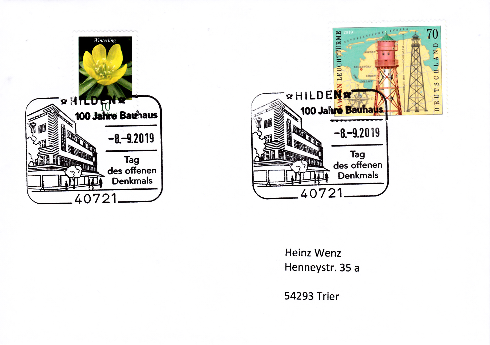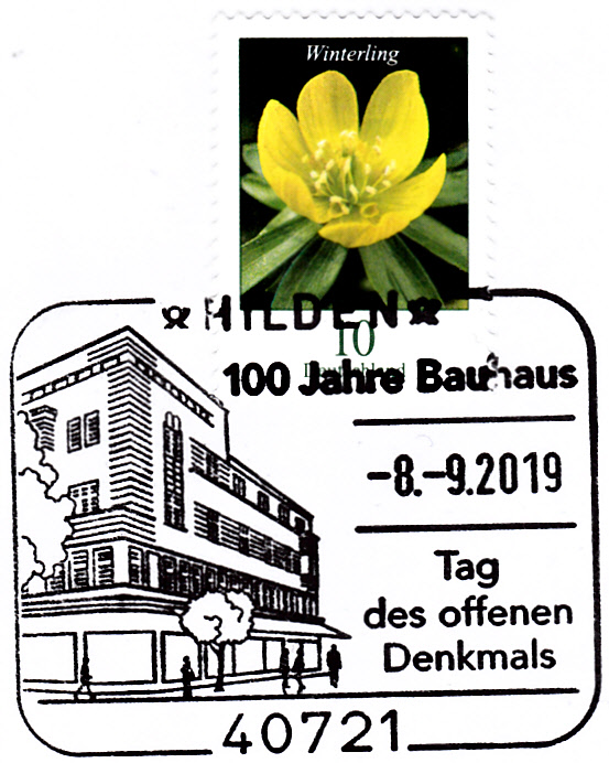 Sonderstempel aus Huilden vom 8.9.2019 zum Tag des offenen Denkmals mit einem Gebäude im Bauhausstil im Stempelbild.