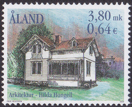 Auf dieser Marke der Ausgabe "Architektur der åländischen Badehausepoche" der Åland-Inseln (MiNr 179) wird ein Haus in Södragatan-Mariegatan von Hilda Hongell gezeigt.