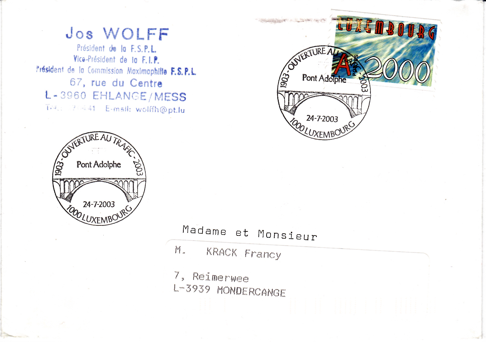 Sonderstempel vom 24.7.2003 aus Luxemburg zum 100. Jahrestag der Einweihung der Adolphe-Brücke.Im Stempelbild wird die Brücke abgebildet.