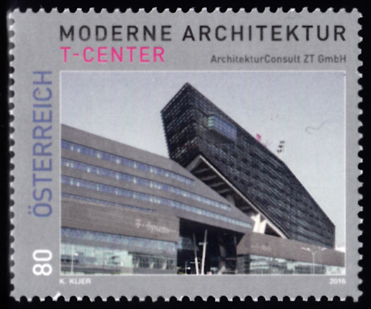 Auf dieser Marke der Serie "Moderne Architektur in Österreich" (MiNr 3292) aus Österreich zeigt das T-Center in Wien nach dem Entwurf von Günther Domenig), Hermann Eisenköck (geb. 1954) und Herfried Peyker (geb. 1947).