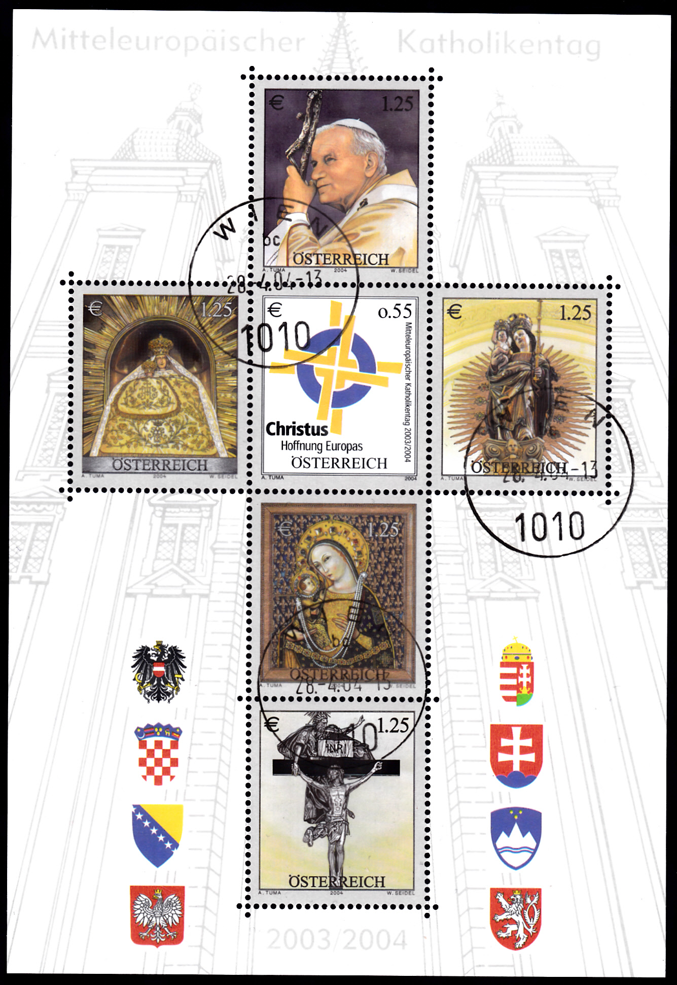 Diese Marke ist zusammen mit fünf weiteren Marken in einem Block (MiNr Block 24 mit den Marken MiNr 2476 bis 2481) zum Mitteleuropäischer Katholikentag in Mariazell erschienen. Hier zeige ich den kompletten Block.
