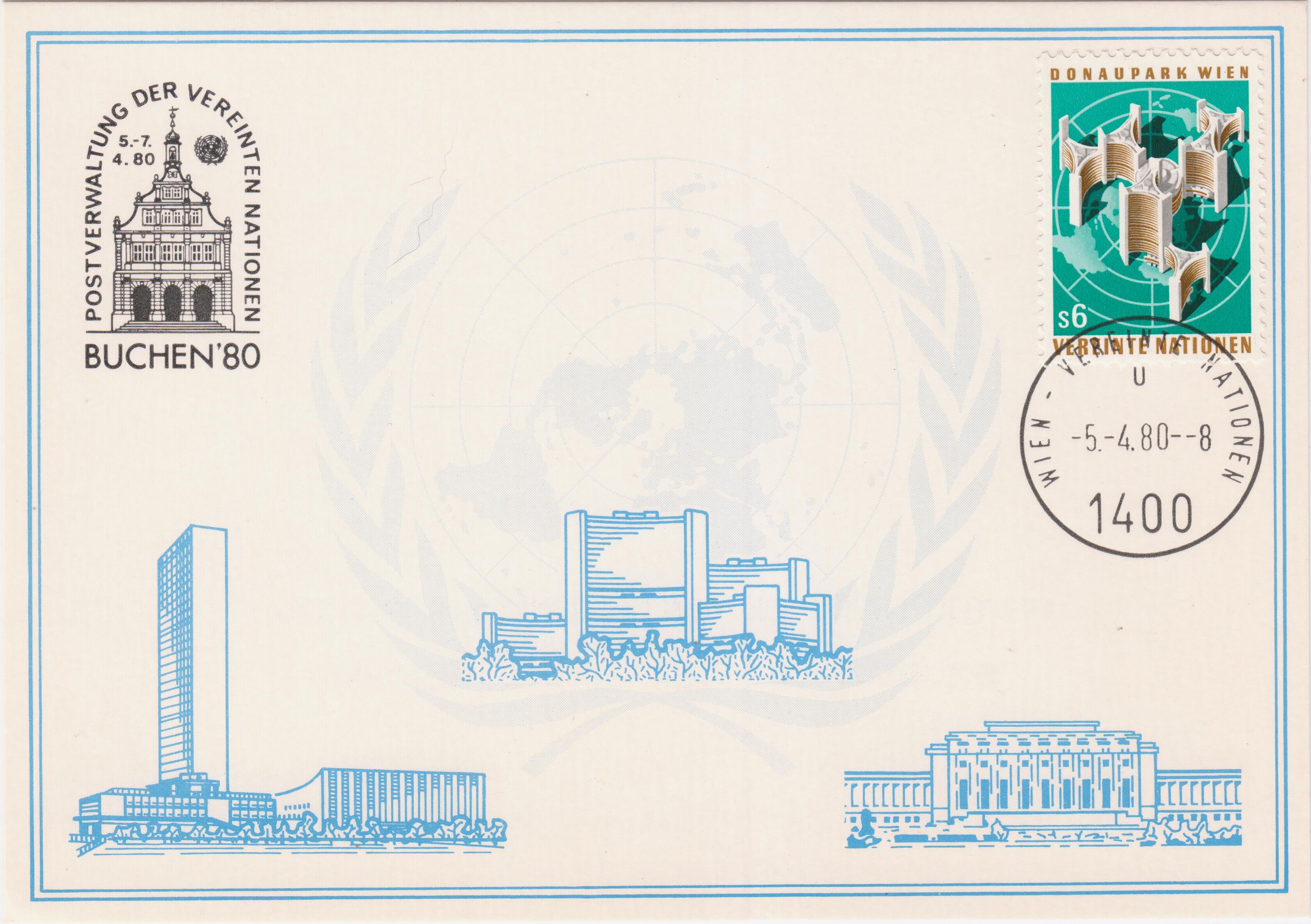 Hier als philatelistische Dokumentation die erste weisse Karte der UNPA Wien, die als Motiv im Erinnerungsstempel das Rathaus in Buchen zeigt:
