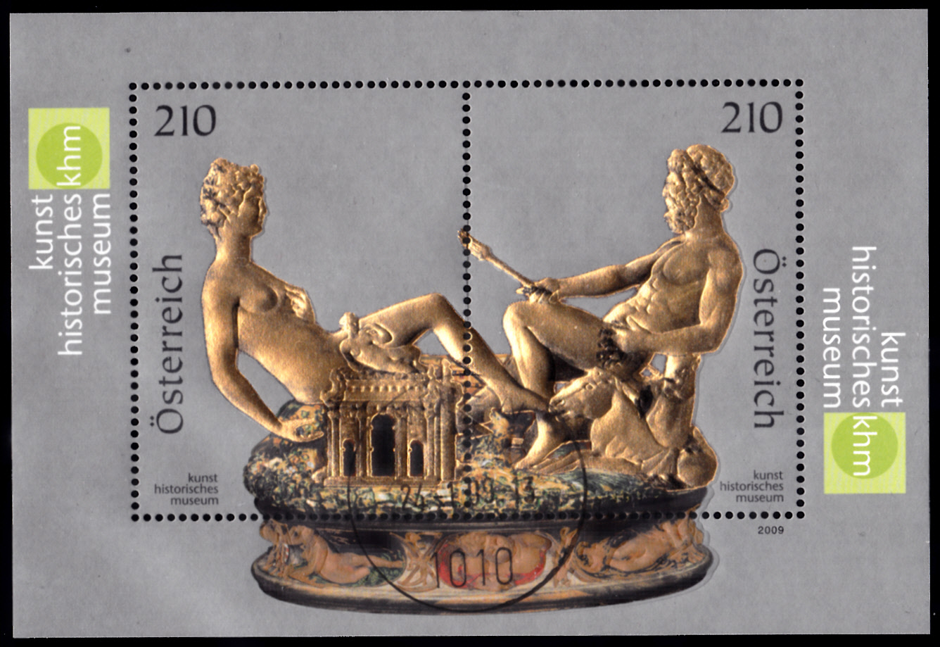 Dieser Block mit zwei Marken (MiNr Block 48 mit den beiden Marken MiNr 2787/2788) bildet die Saliera von Benvenuto Cellini ab.