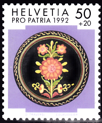 In der Serie "Pro Patria" 1992 zum Thema "Volkskunst" sehen wir auf einer Marke (MiNr 1470) eine Geschirrplatte (Heimberger-Keramik; um 1780).