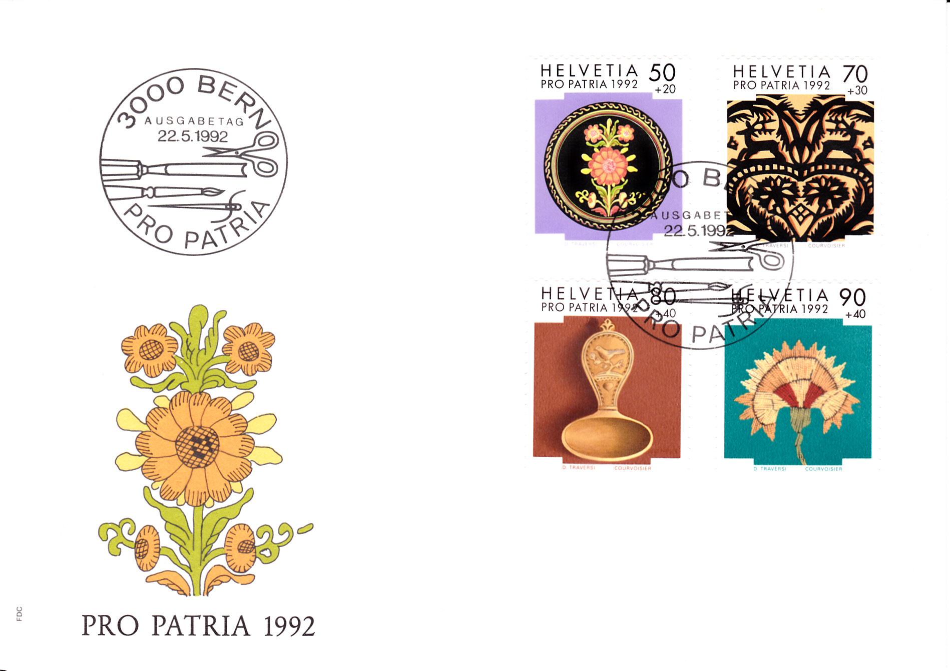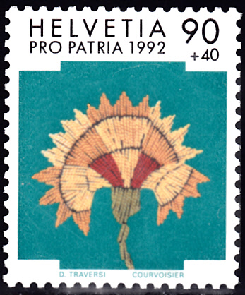 Aus der Serie "Pro Patria" 1992 aus der Schweiz zum Thema "Volkskunst" stammt diese Marke (MiNr 1473) mit einer Bündner Seidenstickerei (um 1780) mit einem Nelkenmotiv.