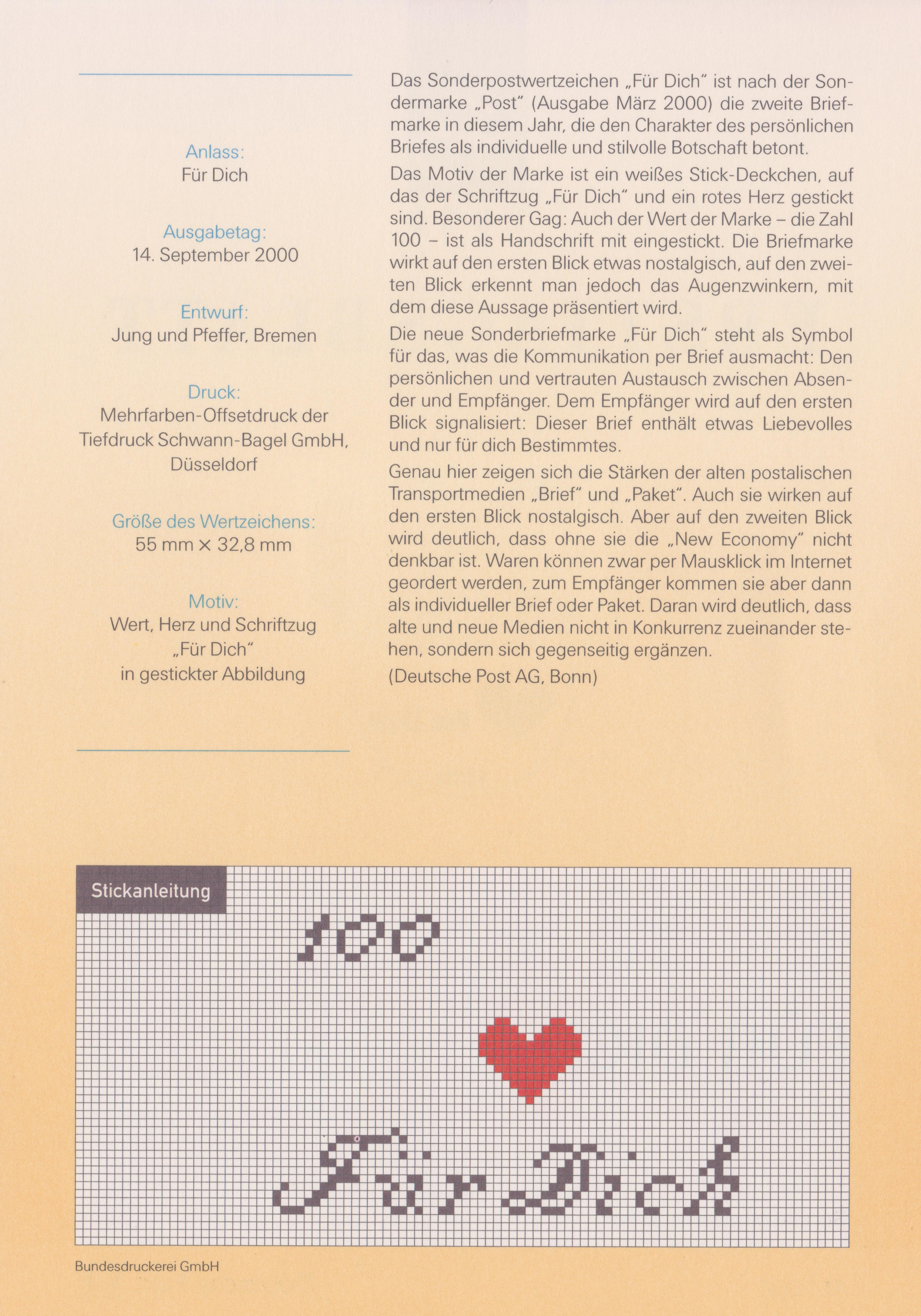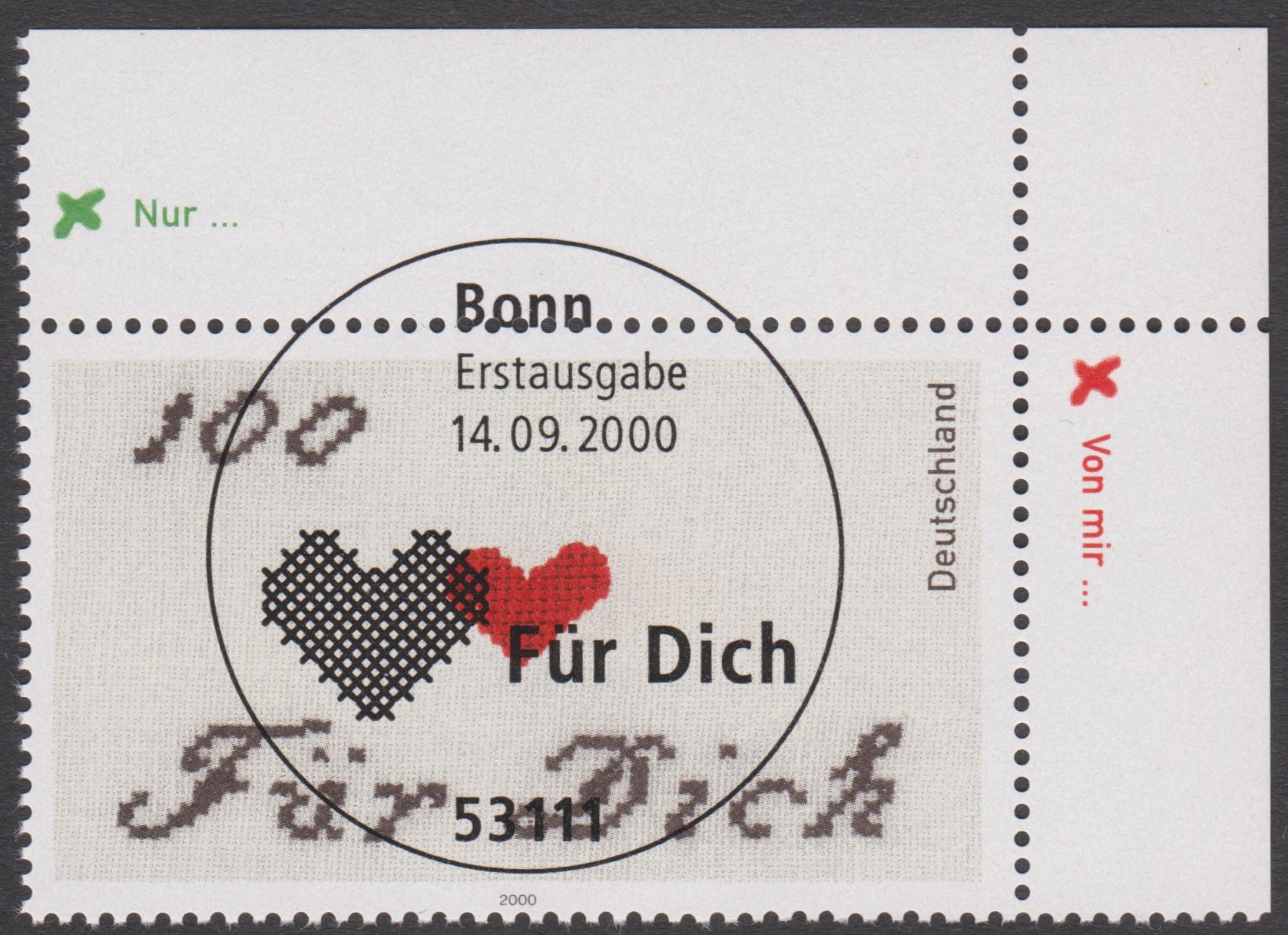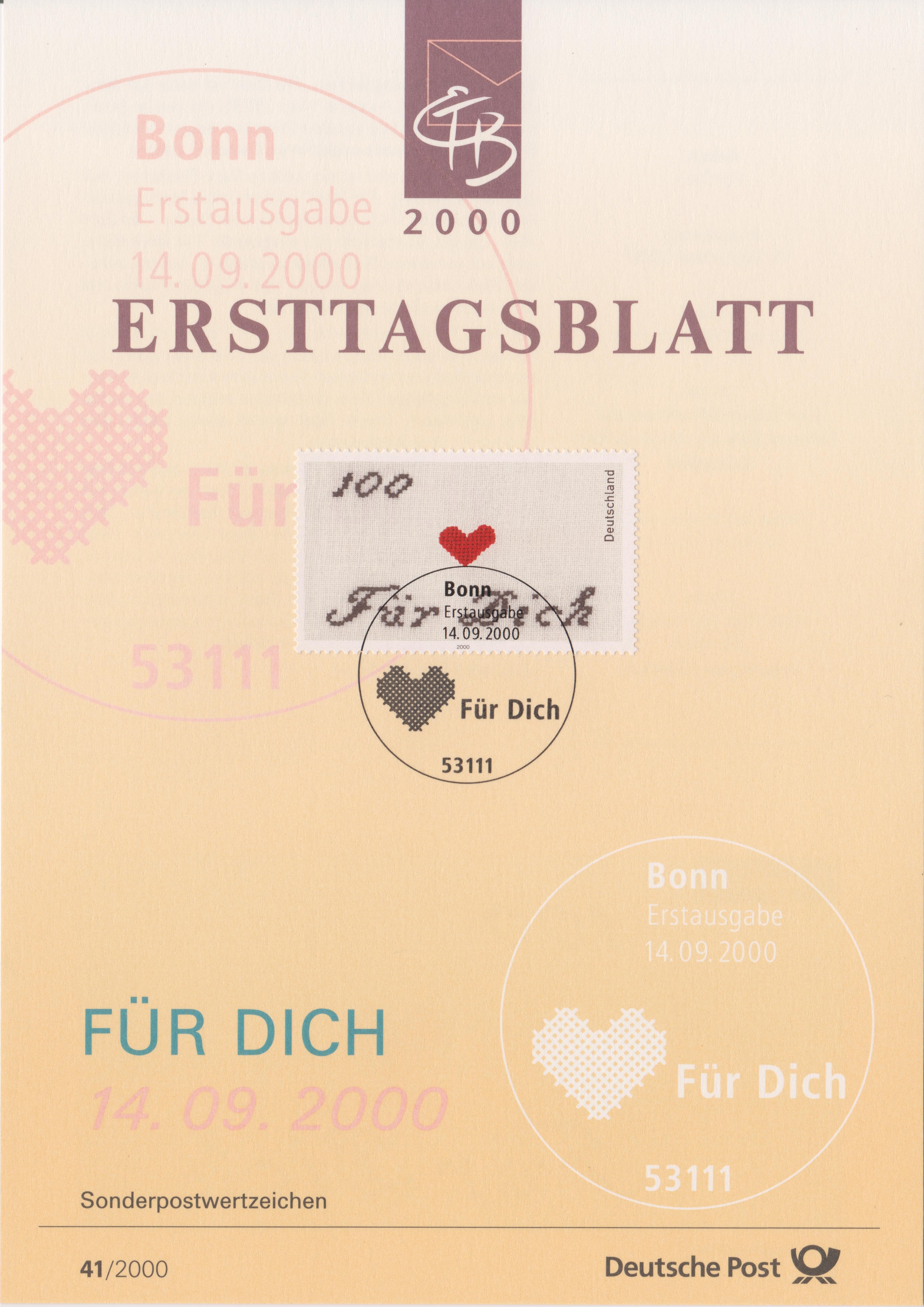 Dieses Ersttagsblatt ETB 41/2000 zeigt das am 14.09.2000 Sonderpostwertzeichen "Für Dich":