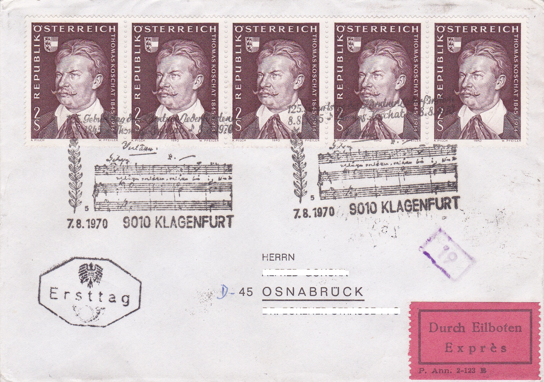 Zum 125. Geburtstag von Thomas Koschat erschien in Österreich eine Marke (MiNr 1336) mit seinem Porträt. Auf diesem Brief mit Eilzustellung von Klagenfurt nach Osnabrück wurden sechs dieser Marken zur Frankatur verwendet und mit einem Sonderstempel zu seinem Geburtstag am Ersttag der Marke gestempelt. Der Stempel hat die Kennziffer "5".