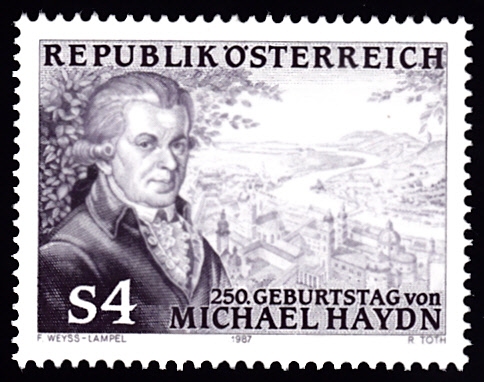 Diese Marke aus Österreich (MiNr 1900) zum 250. Geburtstag von Michael Haydn zeigt ein Porträt von Haydn.