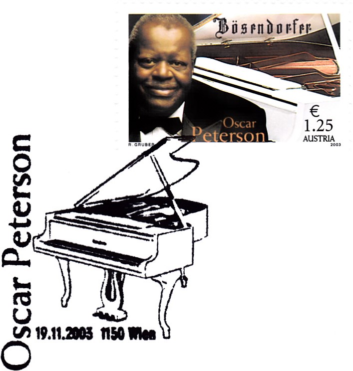 Aus Österreich kommt diese Marke (MiNr 2452) mit einem Porträt von Oscar Peterson aus Anlas des Oscar-Peterson-Konzert anlässlich des Bösendorfer-Jubiläums in Wien.