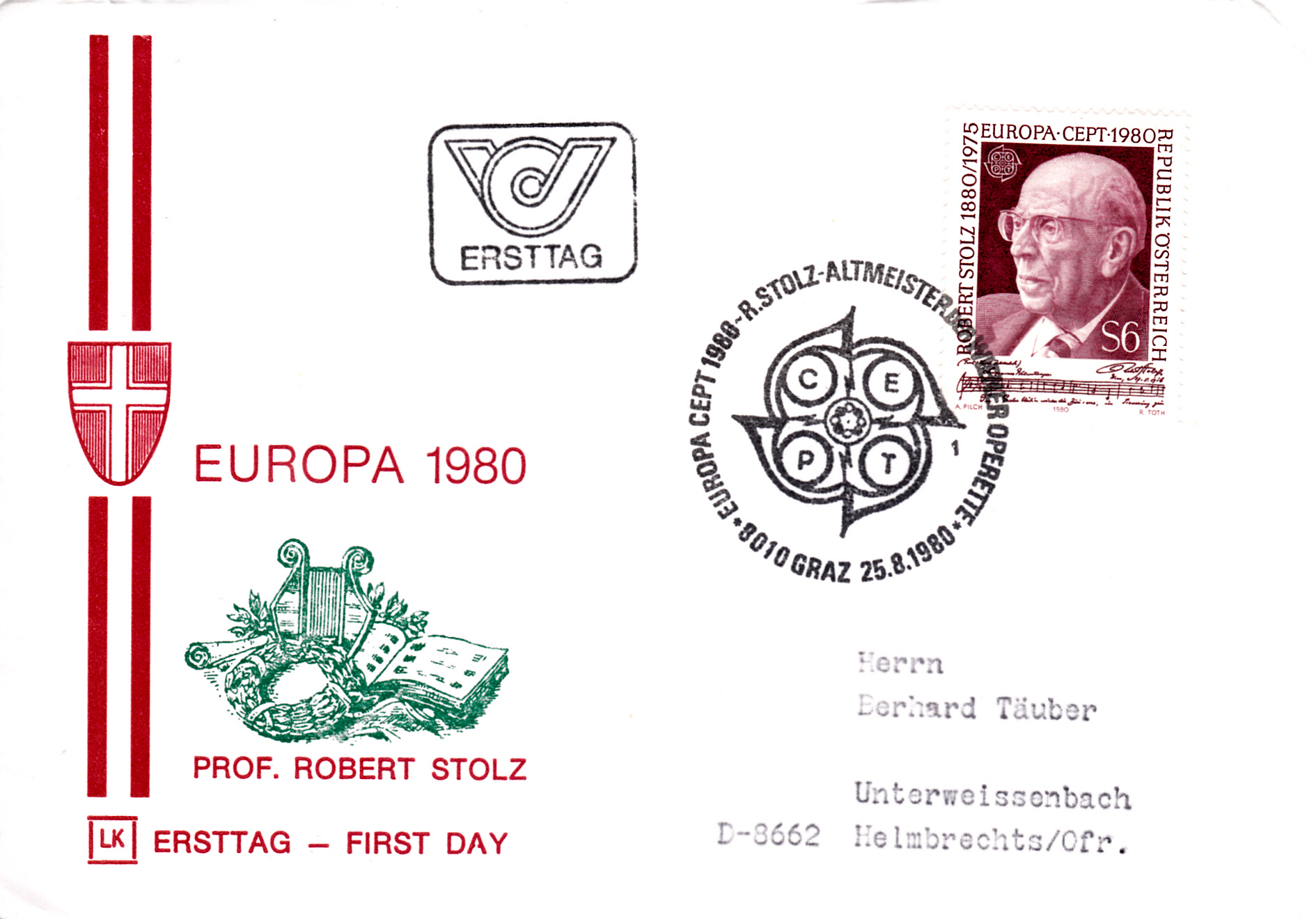 Auslandsbrief nach Deutschland mit der Europamarke 1980 aus Österreich (MiNr 1652) mit einem Porträt von Robert Stolz und dem Ersttagsonderstempel aus Graz.