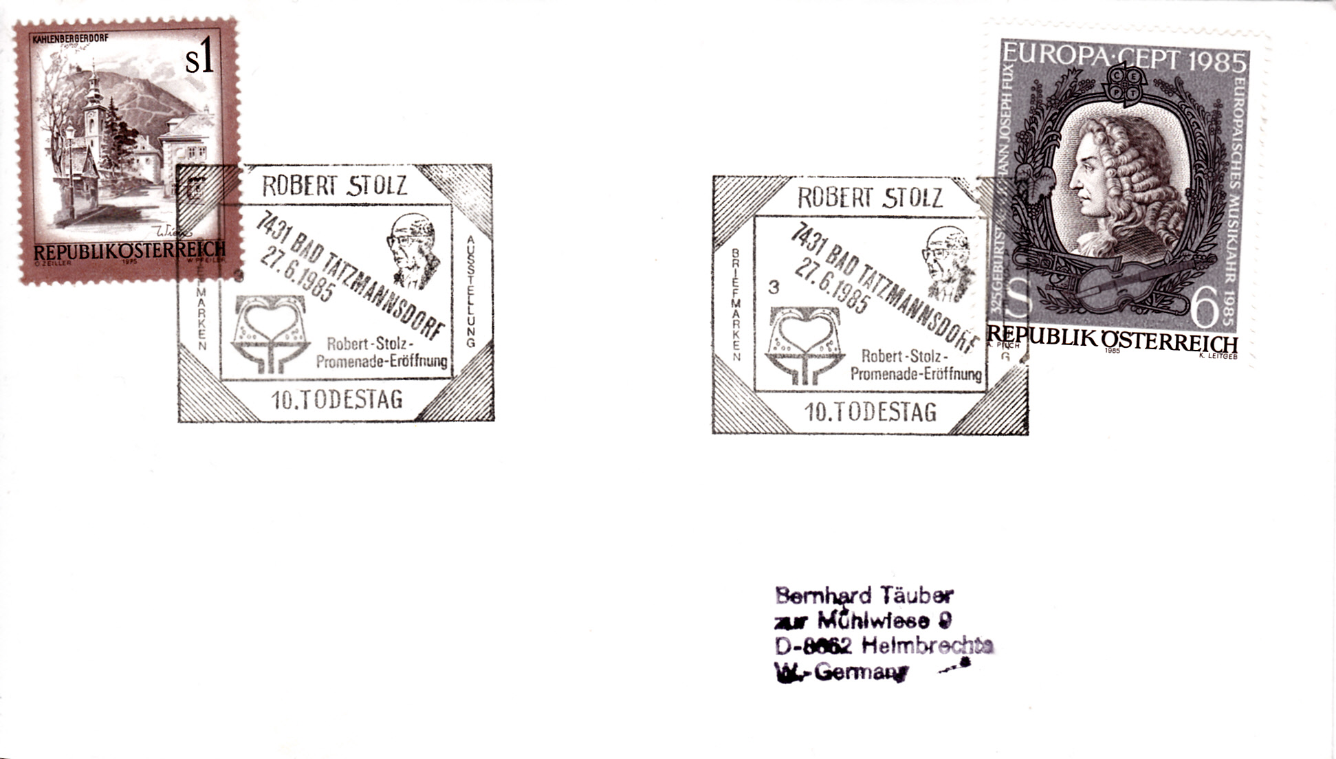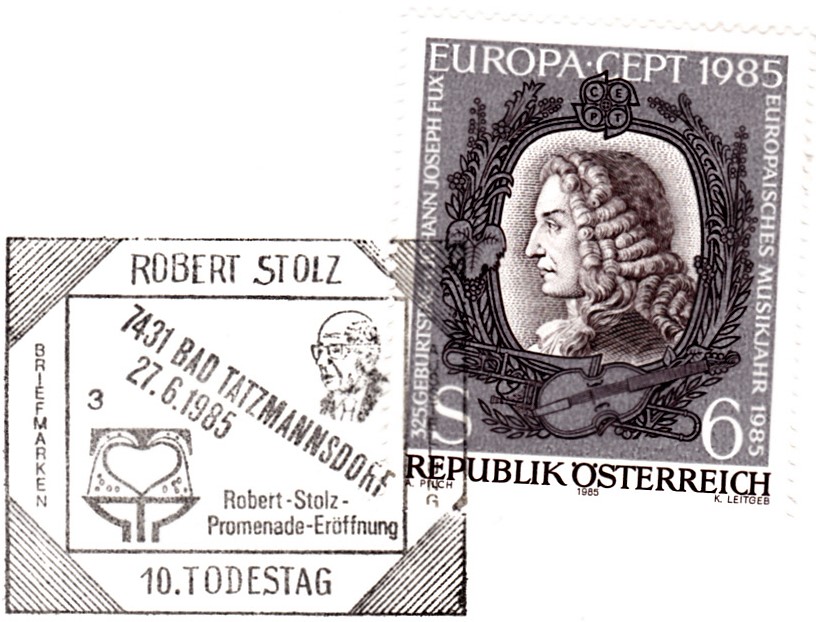 Brief mit der Europamarke 1985 und einem Sonderstempel zum 10. Todestag von Robert Stolz vom 27.6.1985 aus Bad Tatzmannsdorf mit der Kennziffer "3".