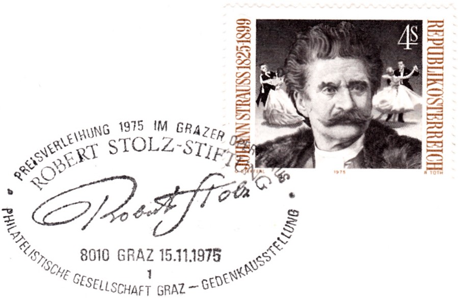 Sonderstempel aus Graz vom 15.11.1975 zur Preisverleihung der Robert Stolz-Stiftung im Grazer Opernhaus. Im Stempel wird die Unterschrift von Robert Stolz gezeigt.