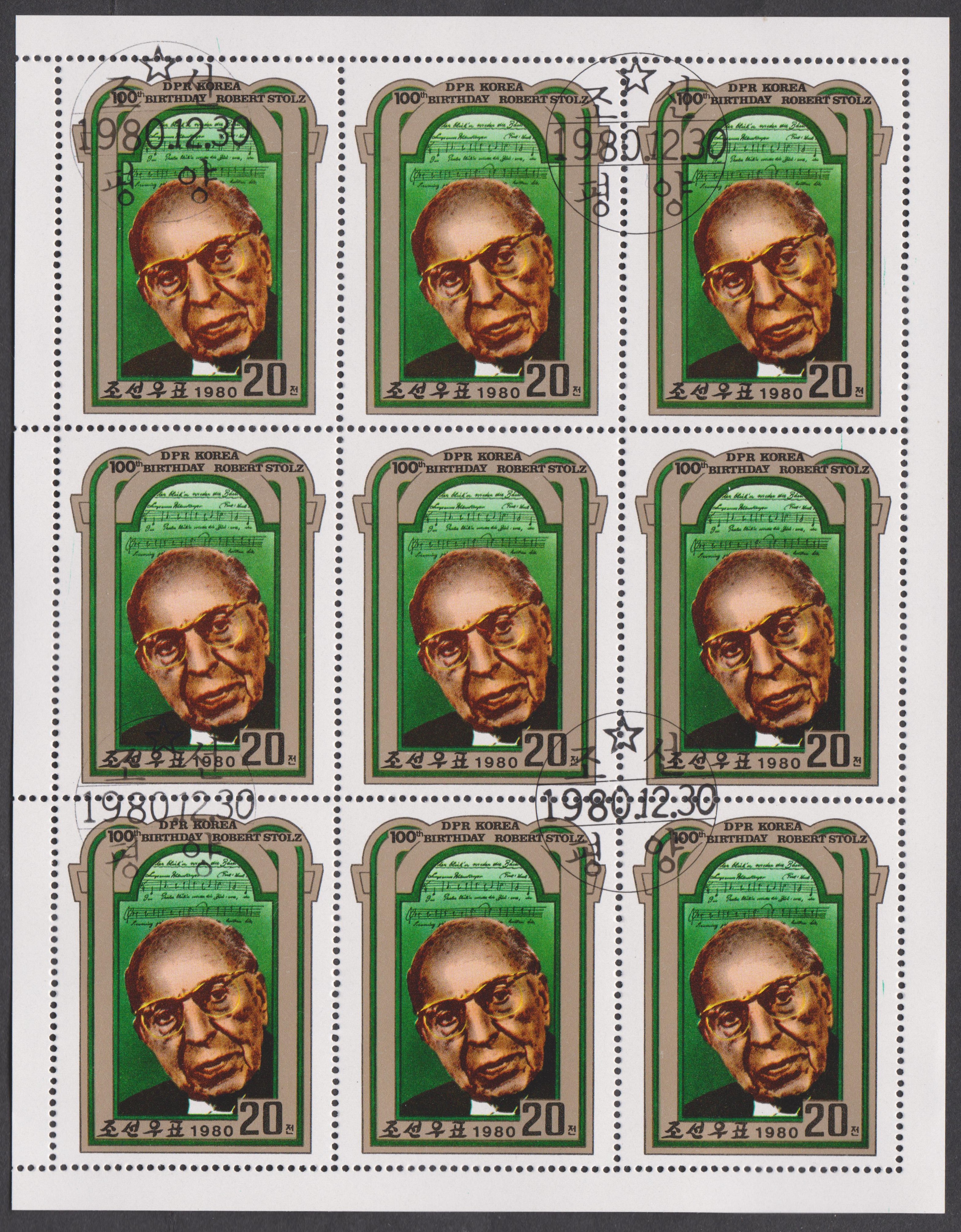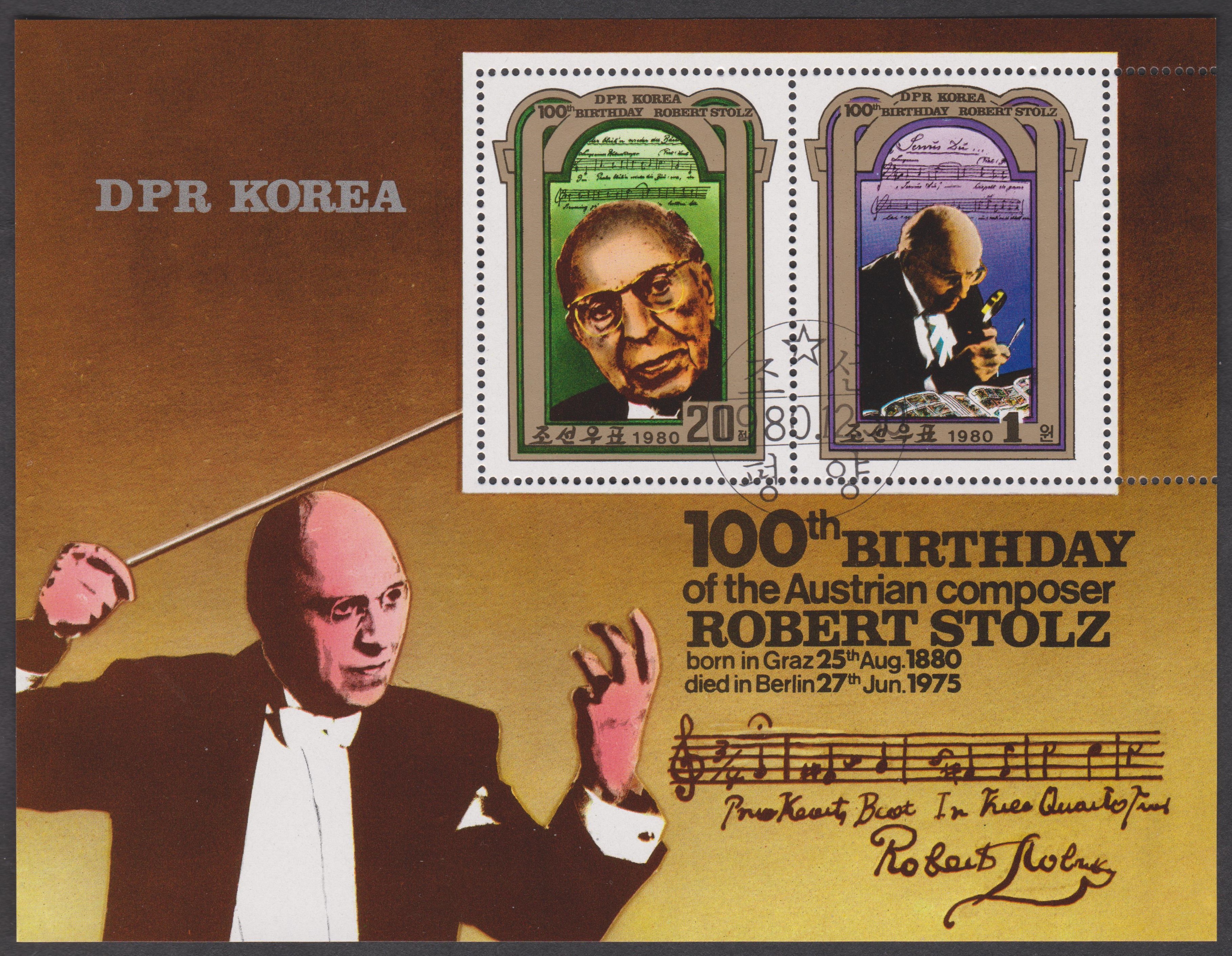 Zum 100. Geburtstag von Robert Stolz sind auch in Nord-Korea Briefmarken erschienen. Hier Block MiNr. 90 A mit den Postwertzeichen MiNr 2077-2078: