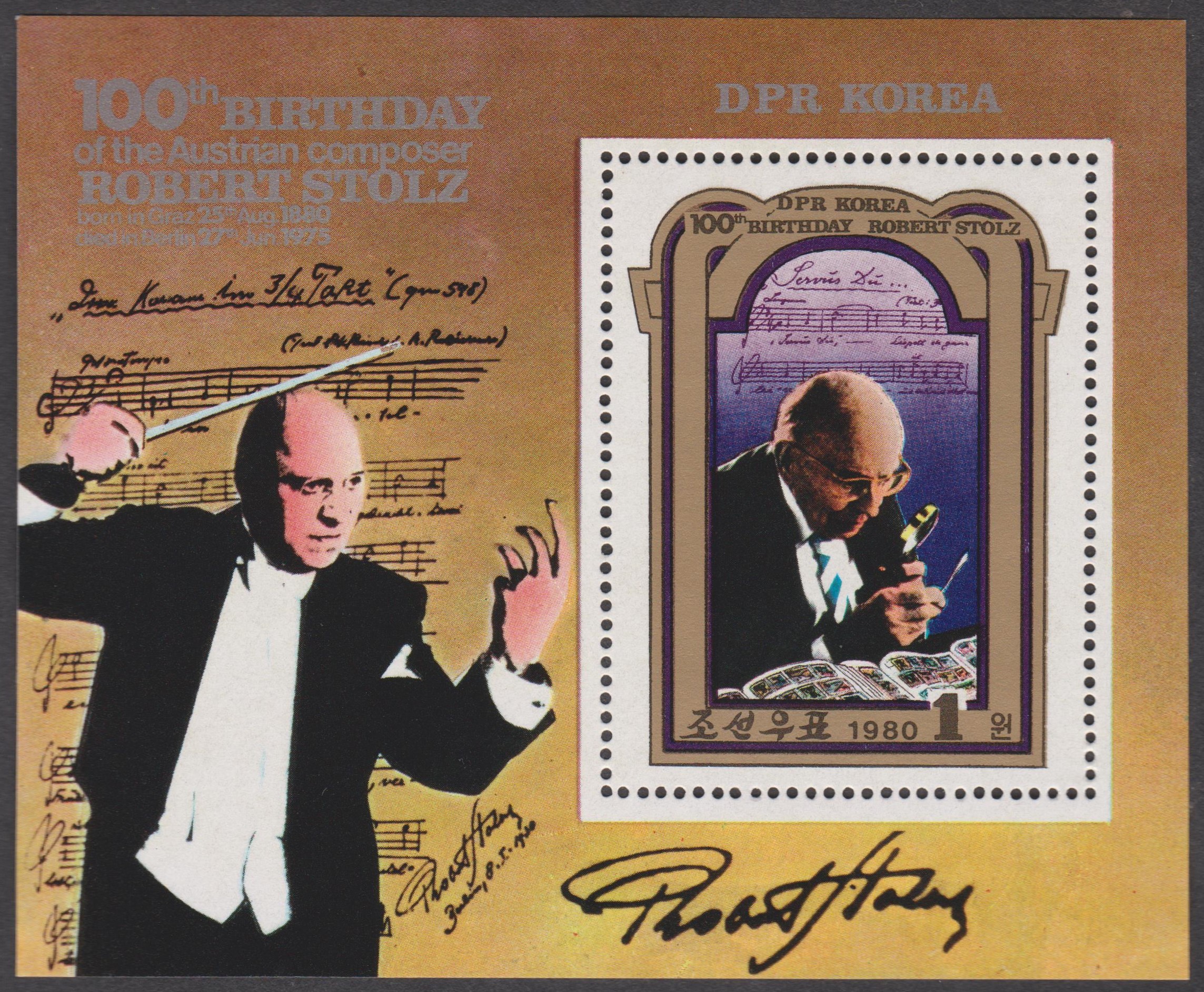 Zum 100. Geburtstag von Robert Stolz sind auch in Nord-Korea Marken erschienen. Hier kann ich einen Block (MiNr Block 90 mit einer Marke MiNr 2078). Auf der Marke wird Robert Stolz mit Briefmarken gezeigt.