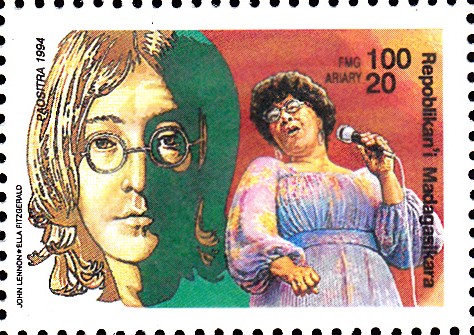 Auf einer Marke aus Madagaskar (MiNr 1760) werden John Lennon und Ella Fitzgerald gezeigt.