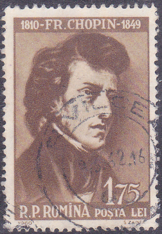 Diese Marke mit einem Porträt von Frédéric Chopin ist in Rumänien (MiNr 1898) zu seinem 150. Geburtstag erschienben.