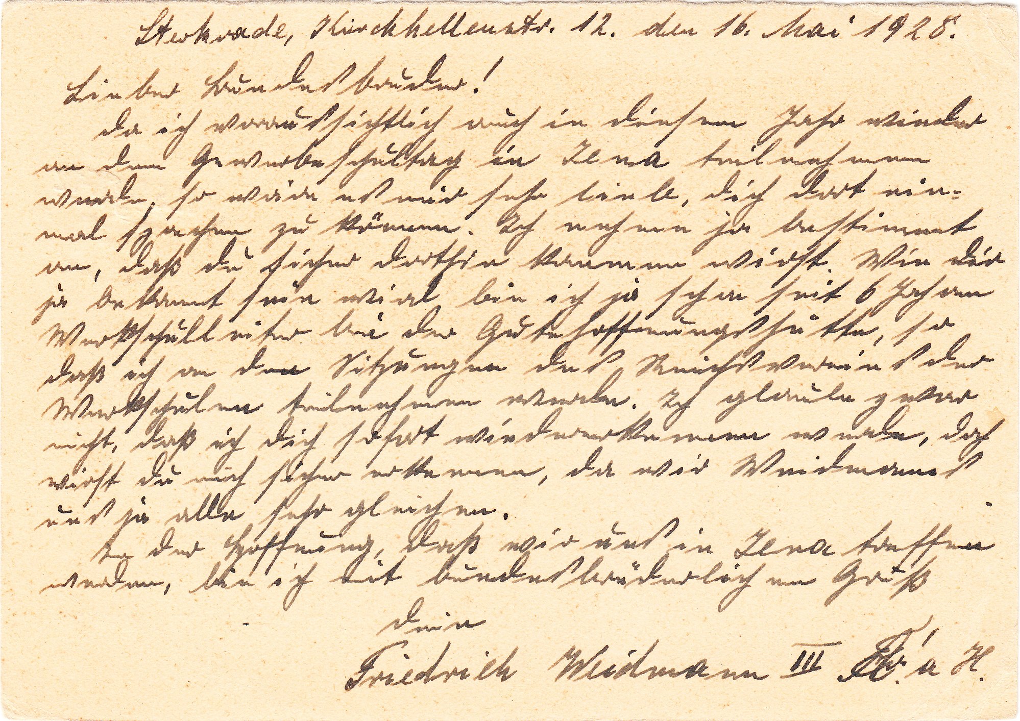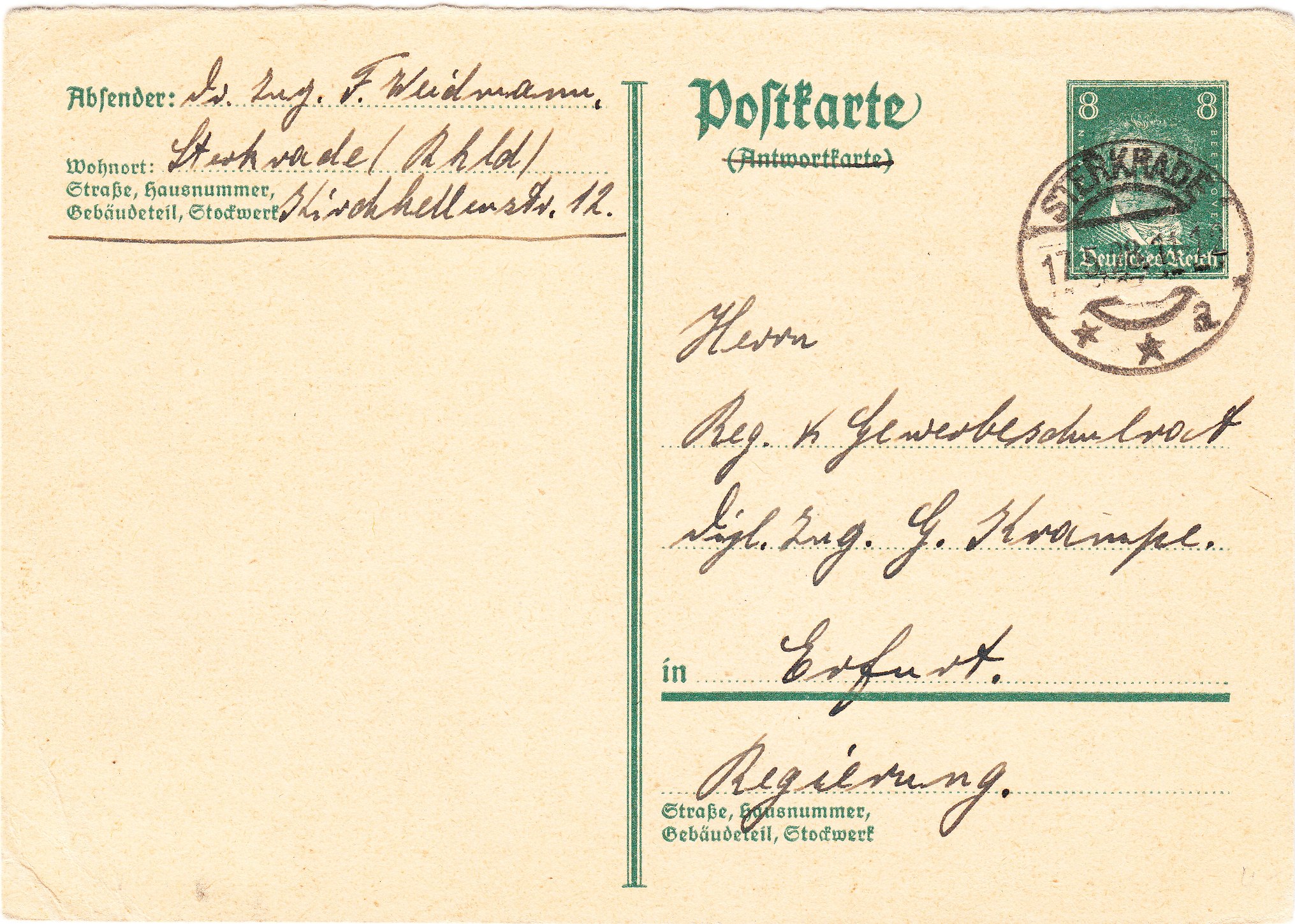 Diese am 17.05.1928 im Fernverkehr von Sterkrade nach Erfurt bedarfsgebrauchte Ganzsache, Deutsches Reich MiNr. P 177 I F, trägt als Wertstempel einen 8 Pfennig Eindruck der Freimarkenserie Berühmte Deutsche: