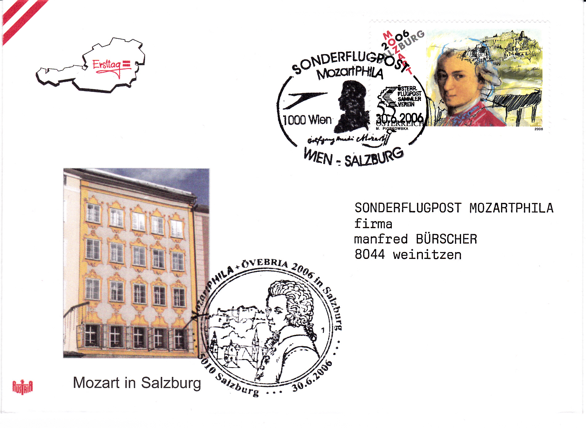 Am 30.6.2006 erschien in Österreich eine weitere Marke (MiNr 2603) zum 250. Geburtstag von W.A.Mozart. Hier ein Exemplar mit einem Sonderstempel von der Sonderflugpost Wien-Salzburg am Ersttag der Marke.
