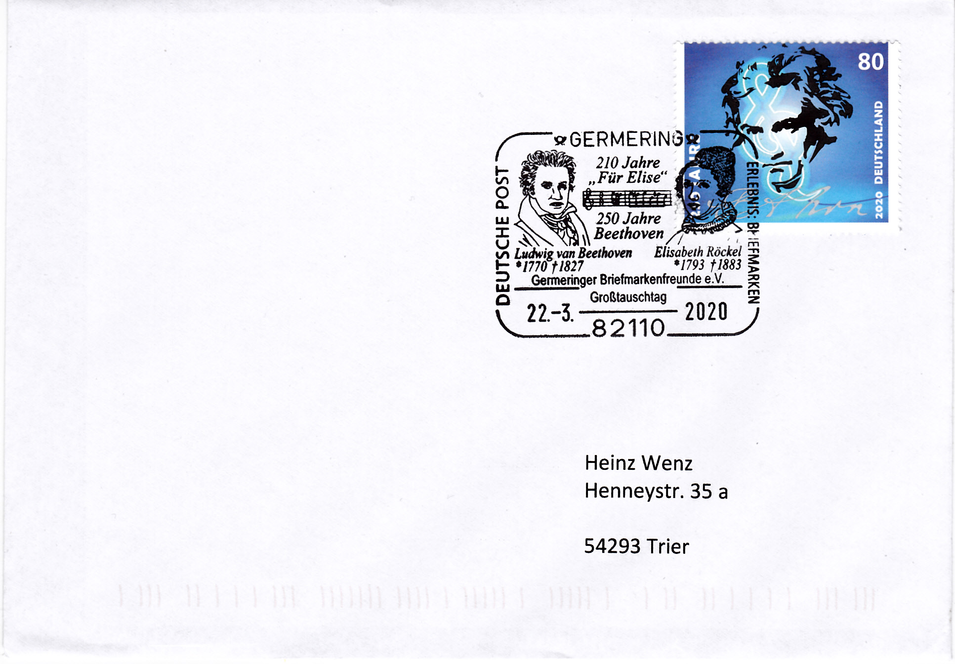 In diesem Sonderstempel vom 22.3.2020 aus Germering ist eine Notensequenz aus "Für Elise" abgebildet. Daneben werden ein Porträt von Ludwig van Beethoven und ein Porträt von Elisabeth Röckel ((getauft als Maria Eva; geb. 15. März 1793 in Neunburg vorm Wald; gest. 3. März 1883 in Weimar; deutsche Opernsängerin) gezeigt. Vermutlich war sein Klavierstück "Für Elise" ihr gewidmet.