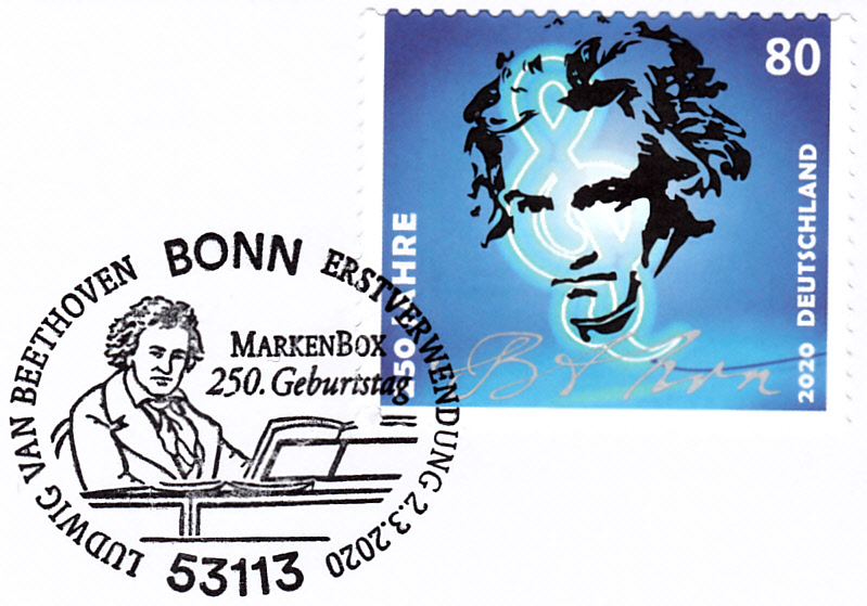 Am Ersttag der Marke zum 250. Geburtstag von Ludwig van Beethoven gab es in Bonn noch einen weiteren Sonderstempel zum "Aktionstag Beethovenjubiläum". Der Stempelm zeigt das Logo des Beethoven Jubiläums 2020.