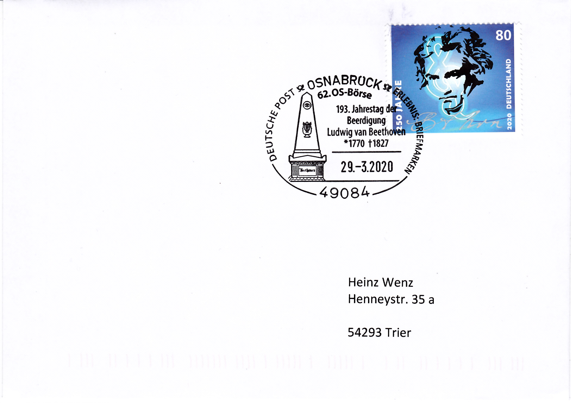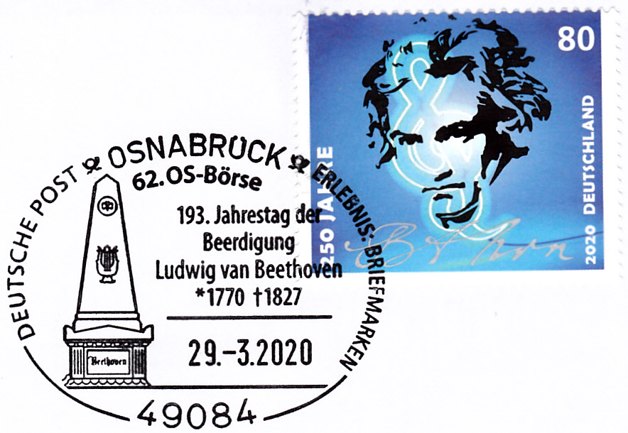 Sonderstempel vom 29.3.2020 aus Osnabrück zum 193 Jahrestag der Beerdigung von Ludwig van Beethoven. Im Stempel wird das Grabmal von Ludwig van Beethoven auf dem Zentralfriedhof (Ehrenfriedhof) in Wien gezeigt.