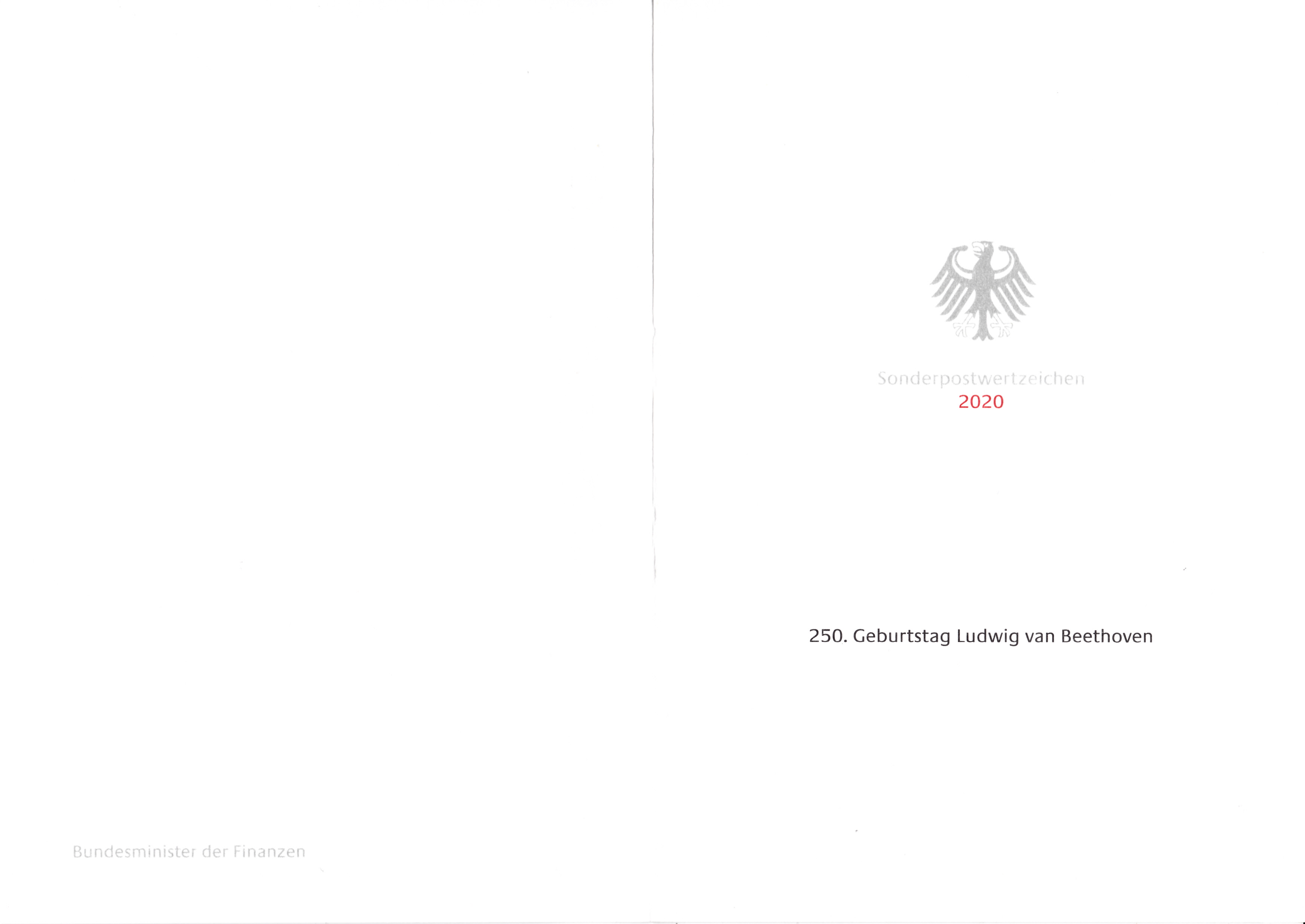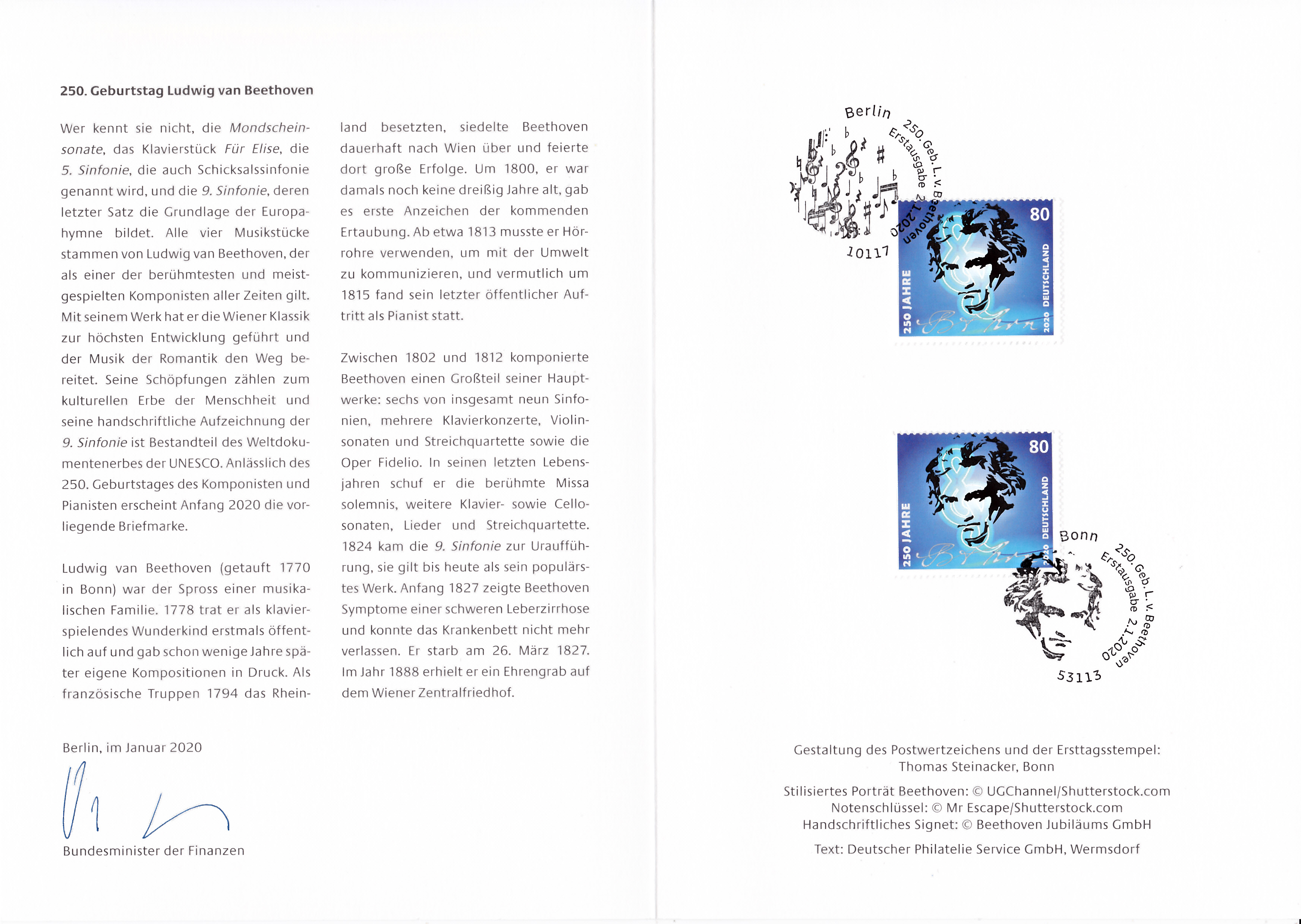 Ministerkarte des Finanzministers mit zwei Marken "250. Geburtstag von Ludwig van Beethoven" (MiNr 3513) und den beiden Ersttagsonderstempel Bonn und Berlin.