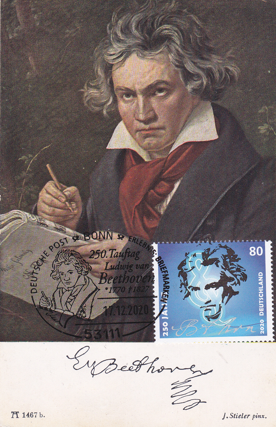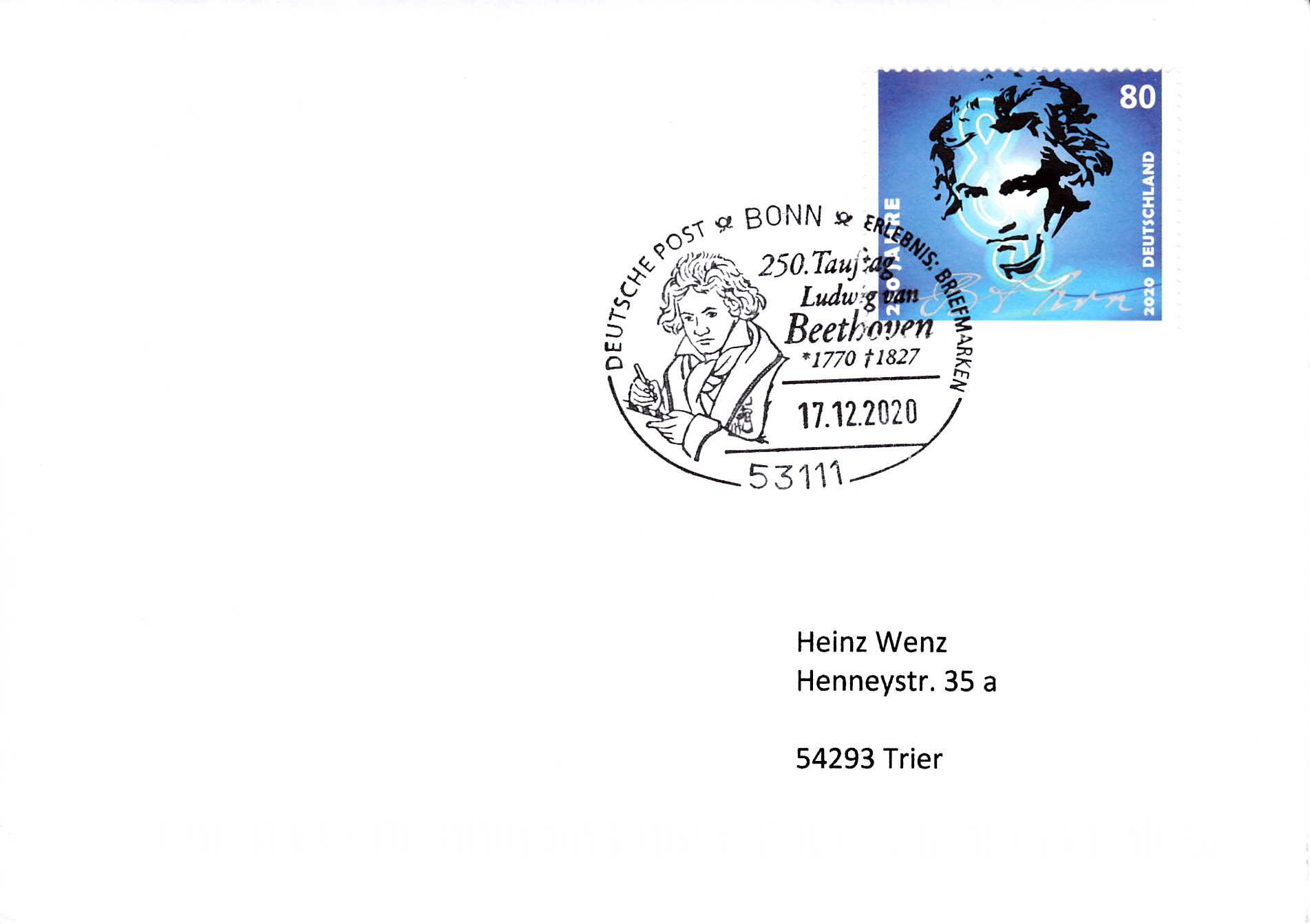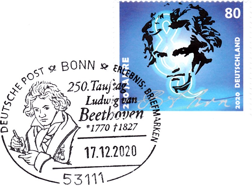 Sonderstempel vom 17.12.2020 aus Bonn zum 250. Tauftag von Ludwig van Beethoven.