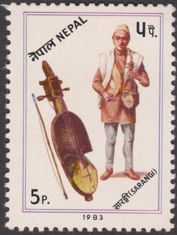 Nepal MiNr. 429 zeigt eine Sarangi sowie einen Sarangispieler: