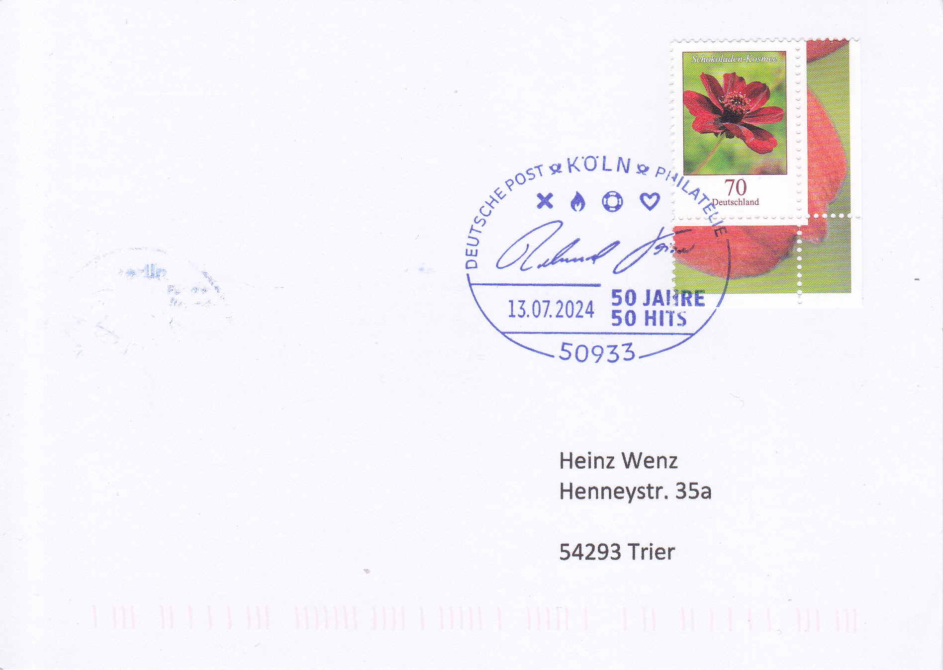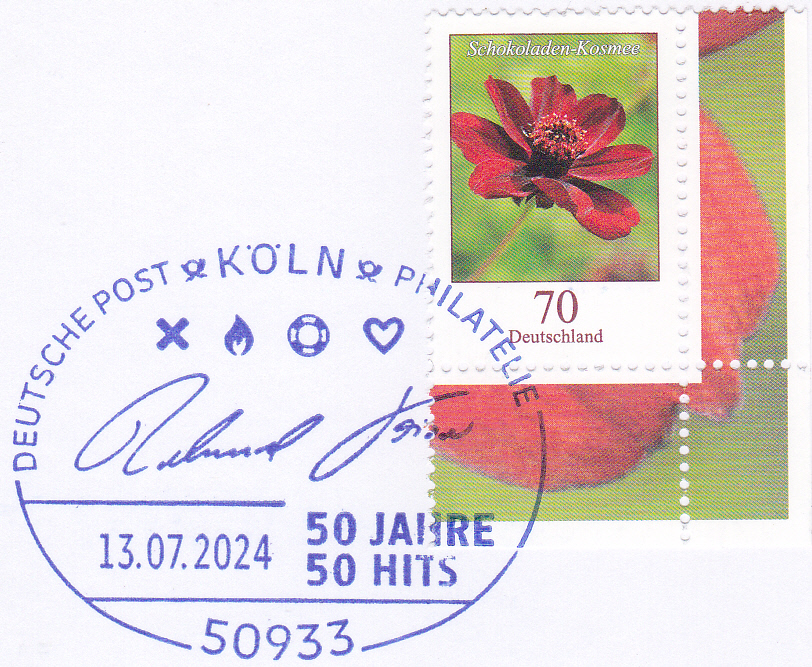 Dieser Sonderstempel aus Köln vom 13.7.2024 zeigt die Unterschrift von Roland Kaiser. Er erinnert an den Beginn der Karriere von Roland Kaiser mit der im Jahr 1974 veröffentlichten ersten Single "Was ist wohl aus ihr geworden"?