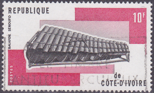 Aus der Elfenbeinküste kommt diese Marke (MiNr 506) mit einem Xylophon.
