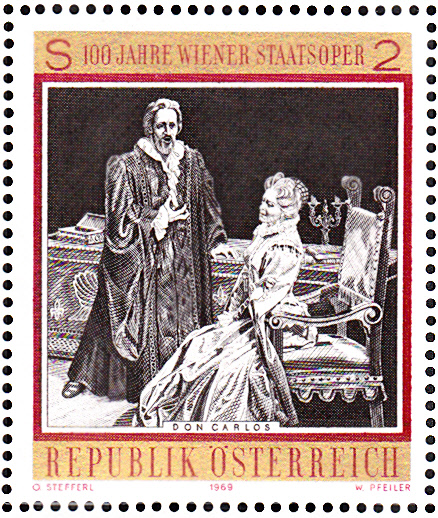 Diese Marke aus Österreich (MiNr 1298) zeigt eine Szene aus der Oper "Don Carlos" von Giuseppe Verdi.