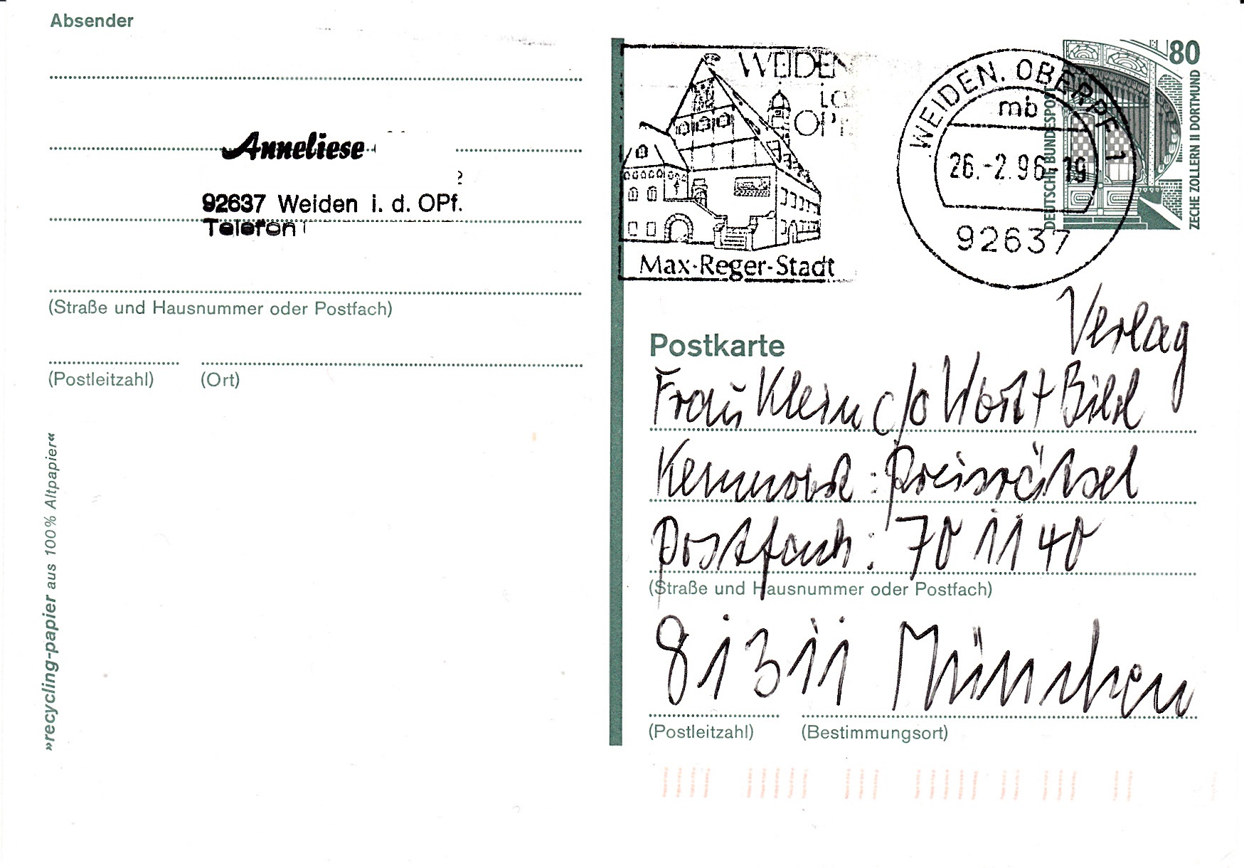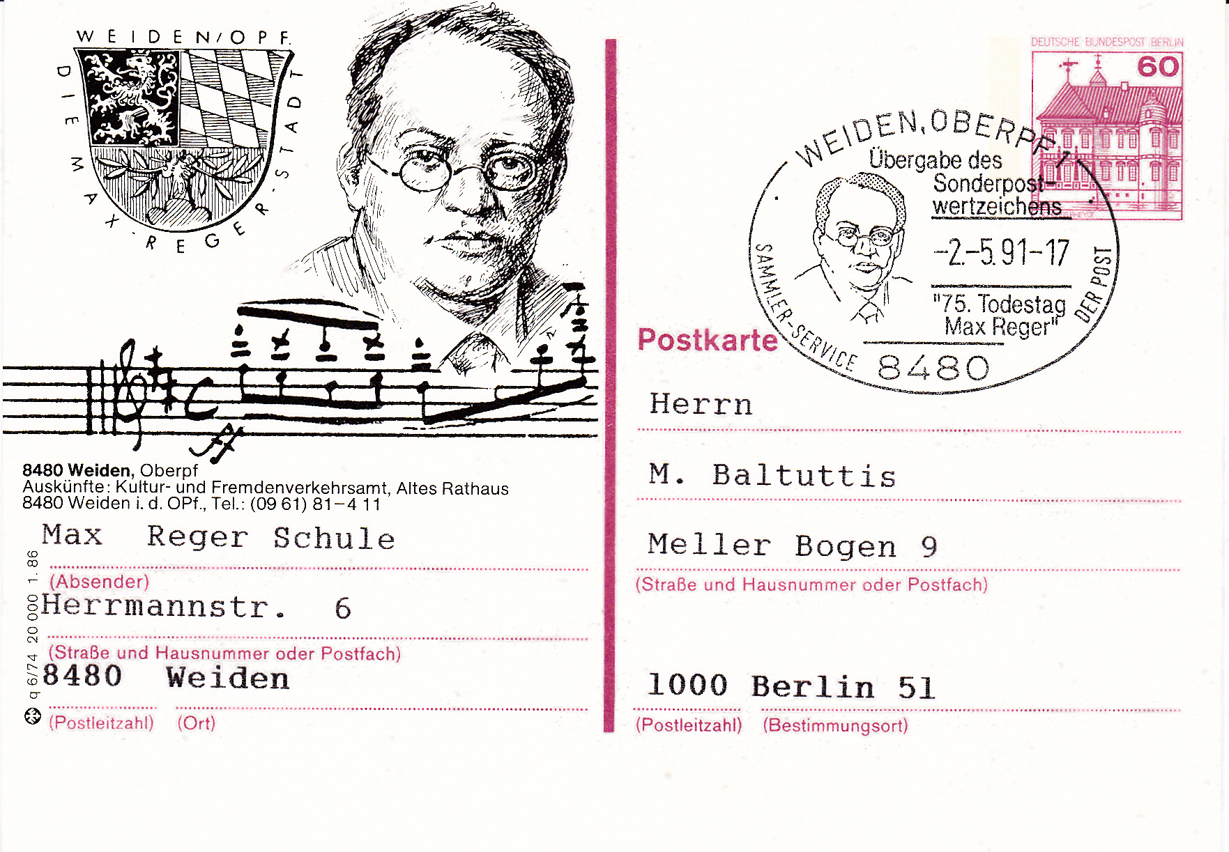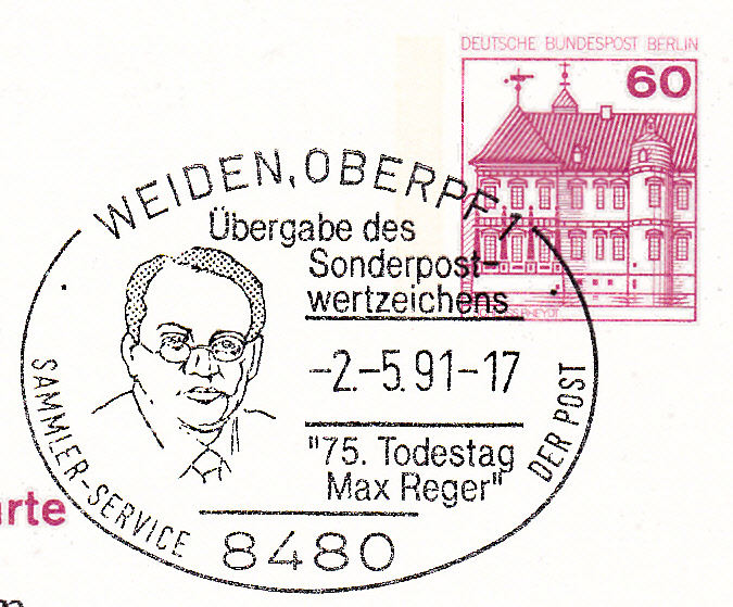 Sonderstempel vom 2.5.1991 aus Weiden zur Übergabe der Marke zum 75. Todestag von Max Reger auf einer Berliner Bildpostkarte aus der Jahrgang 1986, die ebenfalls ein Porträt von Max Reger zeigt.
