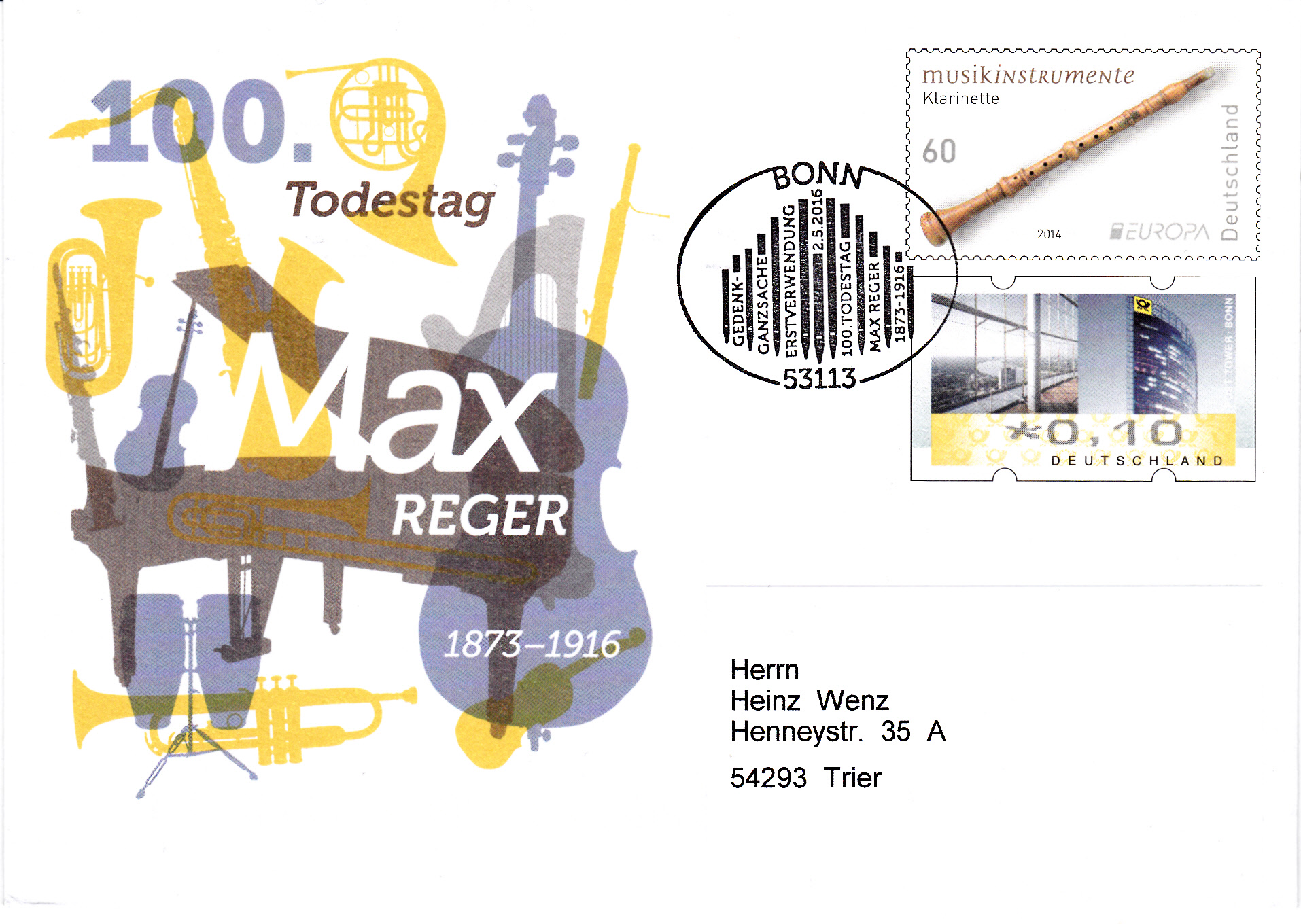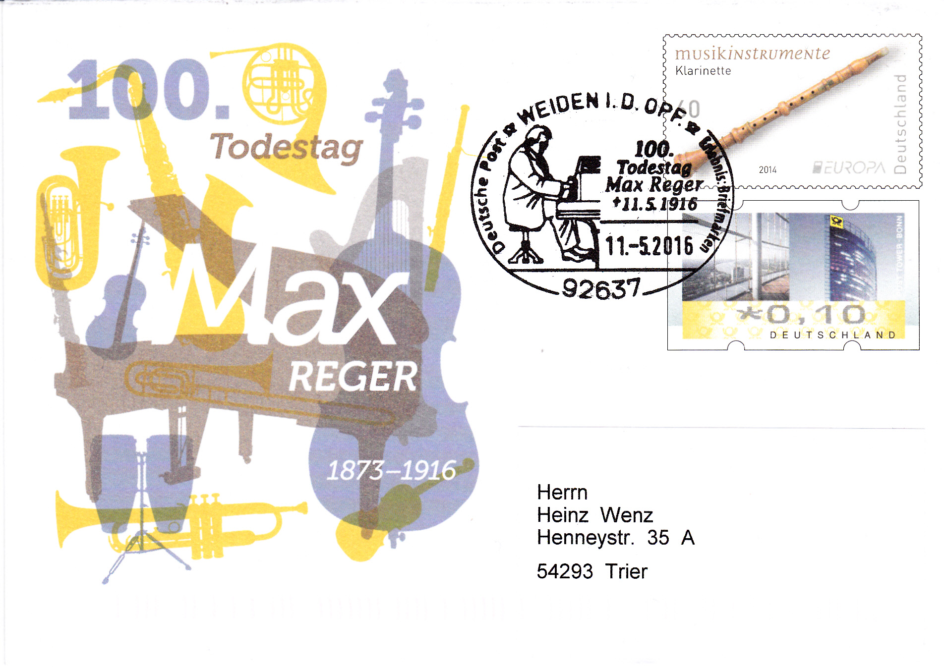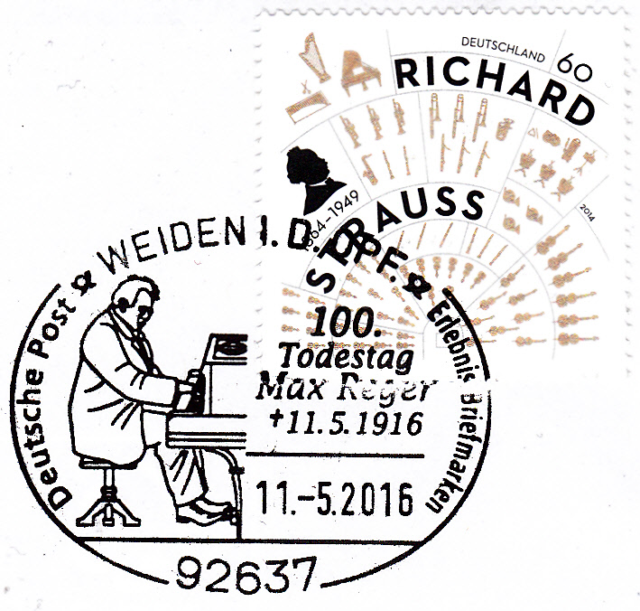 Hier der bereits gezeigte Sonderumschlag zum 100. Todestag von Max Reger mit dem Sonderstempel zum gleichen Anlass aus Weiden in der Oberpfalz vom 11.5.2016.
