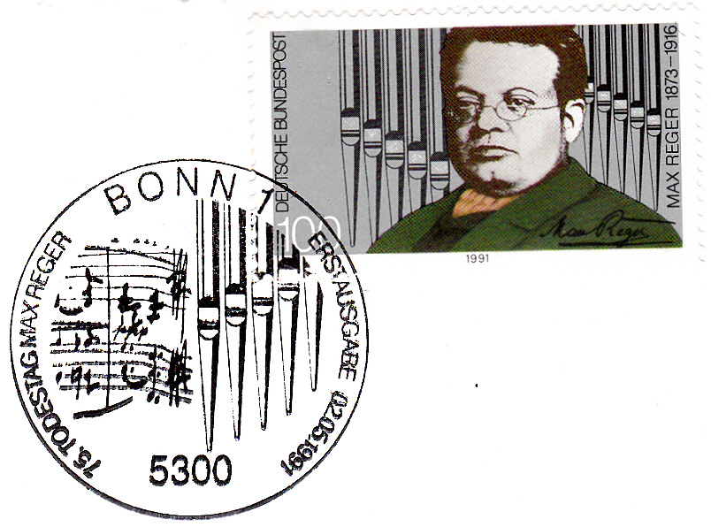 Die Marke zum 75. Todestag von Max Reger der Deutschen Bundespost wurde hier mit dem Ersttagsonderstempel aus Bonn entwertet.