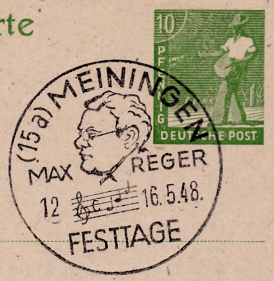 Sonderstempel vom 16.5.1948 aus Meiningen zu den Max Reger Festtagen. Im Stempelbild wird ein Porträt von Max Reger gezeigt.