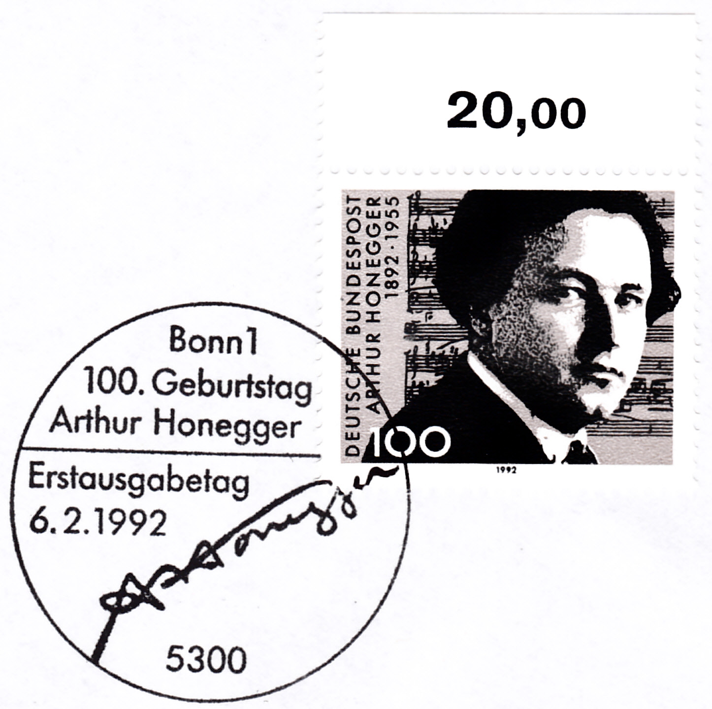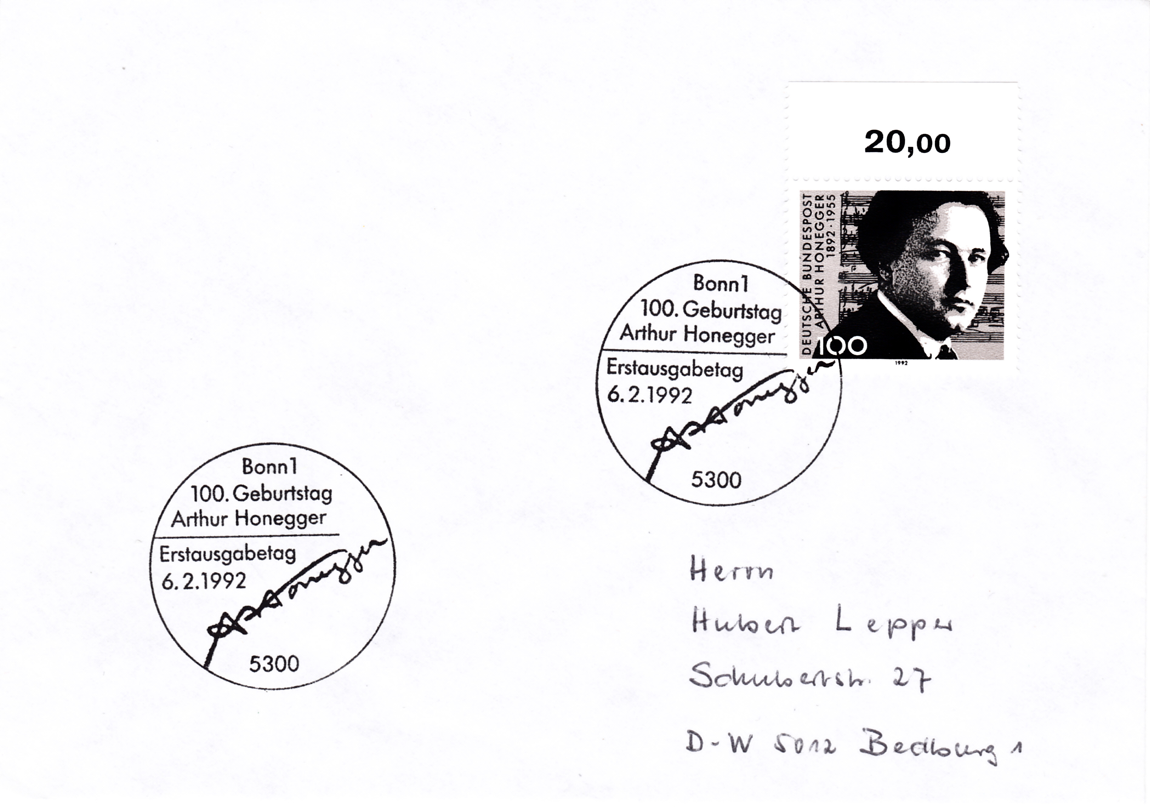 Ersttagsbrief mit der Marke zum 100.Geburtstag von Arthur Honegger mit dem Ersttagsonderstempel aus Bonn, der eine Unterschrift von ihm zeigt.