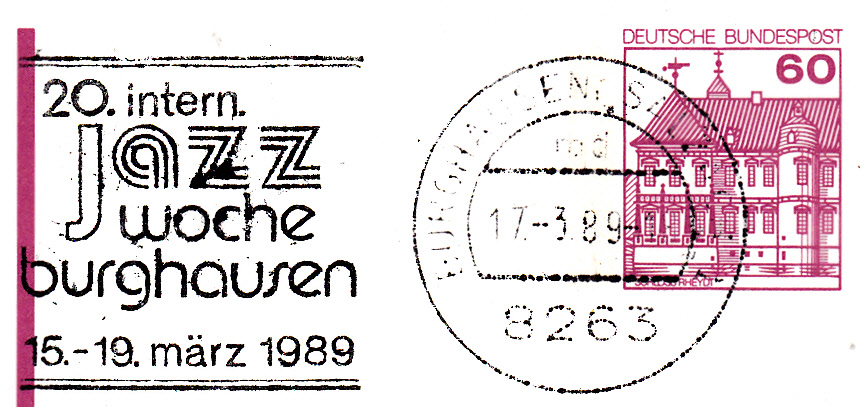 Maschinenwerbestempel vom 17.3.1989 aus Burghausen, Salzach mit einem Werbeeinsatz zu den 20. Internationalen Jazzwochen Burghausen vom 15.-19.März 1989.
