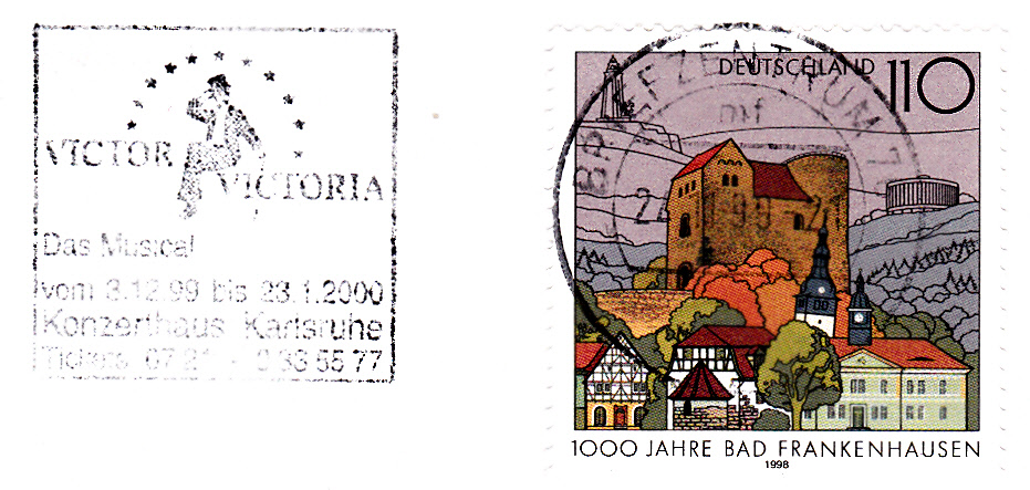 Maschinenwerbestempel des Briefzentrums 76 (leider in schlechter Qualität) vom 22.11.1999 mit einem Werbeeinsatz "Victor/Victoria Das Musical vom 3.12.99 bis 23.1.2000 Konzerthaus Karlsruhe, Tickets 0721 - 9335577"