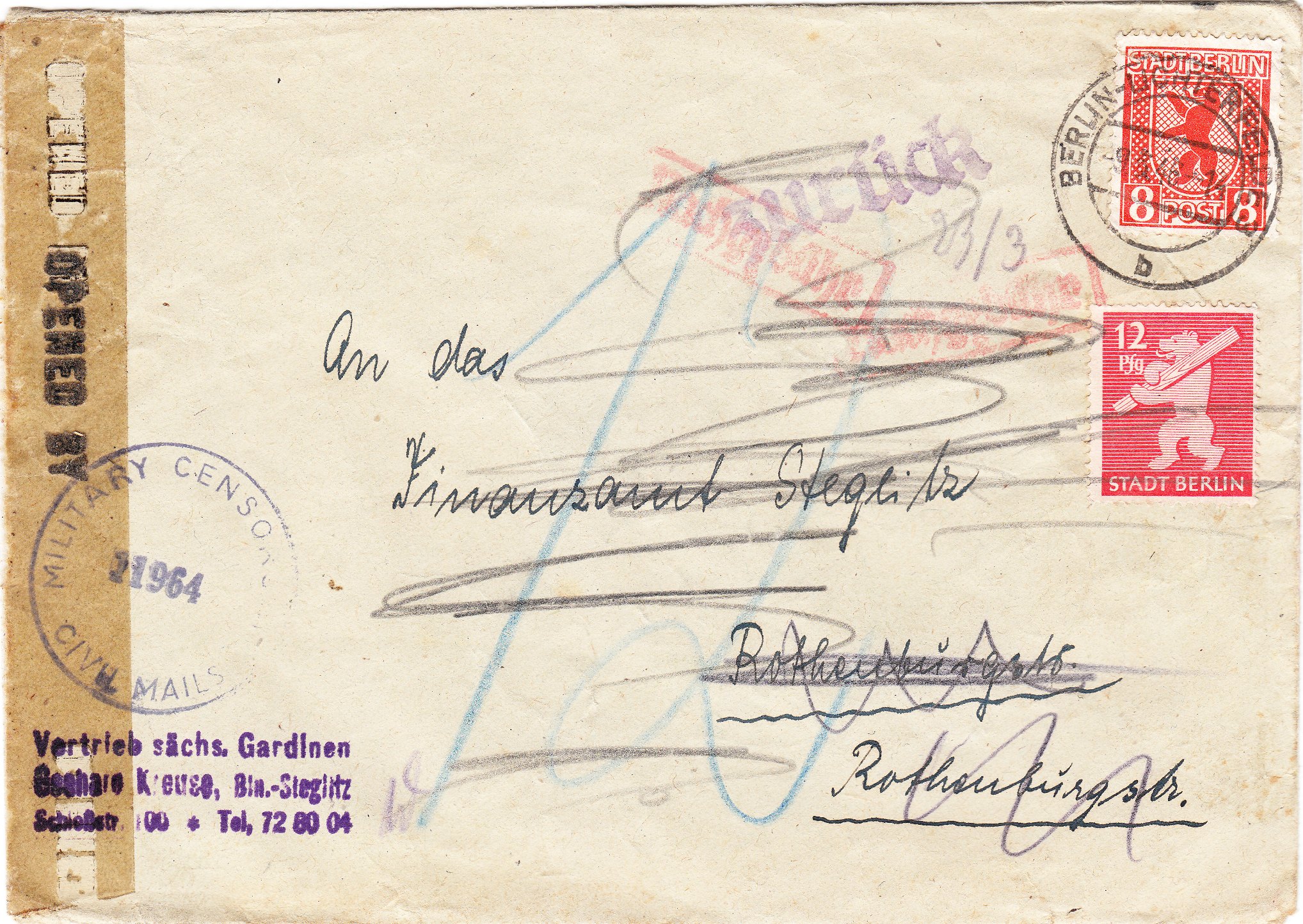 Der Brief lief durch die US-amerikanische Militärzensurstelle in Berlin, wurde dort linksseitig geöffnet und mit einem Zellophanstreifen "OPENED BY MIL. CEN.-CIVIL MAILS" wieder verschlossen, was ein vorderseitig abgeschlagener Prüferstempel "11964" dokumentiert.