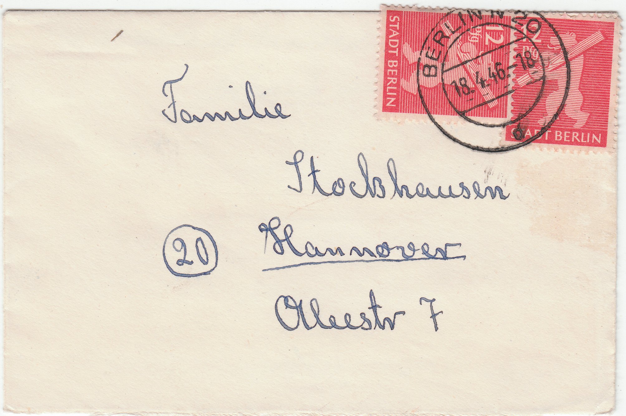 Hier eine MeF von zwei Exemplaren der MiNr. 5 portogerecht auf einem Brief im Fernverkehr (24 Pf), gelaufen am 18.04.1946 von Berlin nach Hannover: