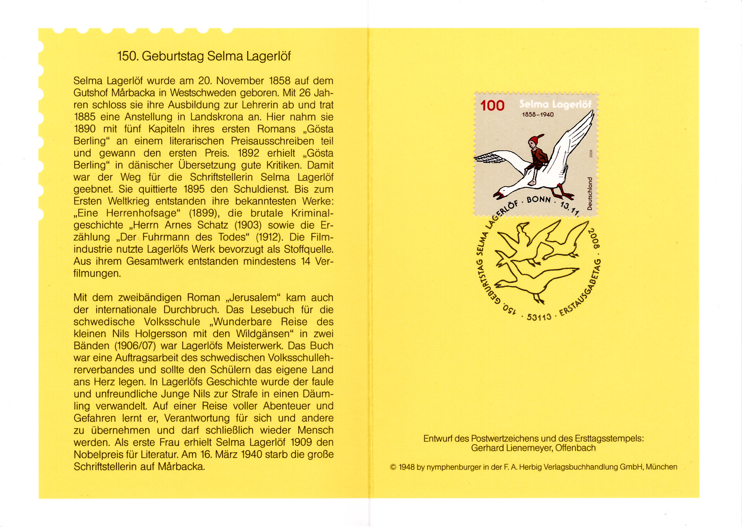Nils Holgerson auf einer Wildgans diente als Motiv für die Marke der Deutschen Post (MiNr 2705) zum 150. Geburtstag von Selma Lagerlöf.