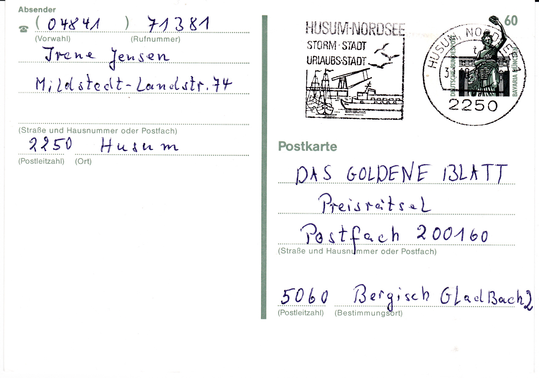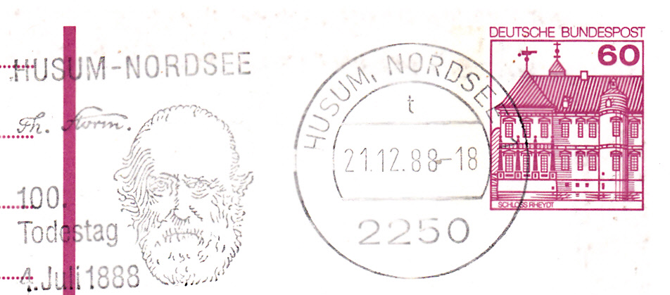 Dieser Maschinenwerbestempel aus Husum, Nordsee 1 enthält im Text "Husum-Nordsee / Storm-Stadt / Urlaubsstadt" wieder einen Hinweis auf die Geburtsstadt von Theodor Storm.