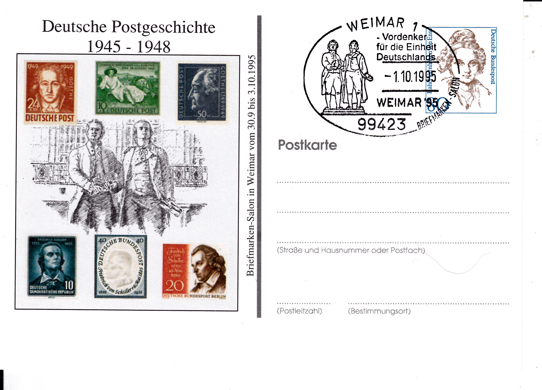 In einer Blockausgabe zum Wiederaufbau des Deutschen Nationaltheaters Weimar ist in der Sowjetischen Besatzungszone für Thüringen (OPD Erfurt) eine weitere Marke (MiNr 107) mit einem Porträt von Schiller erschienen.