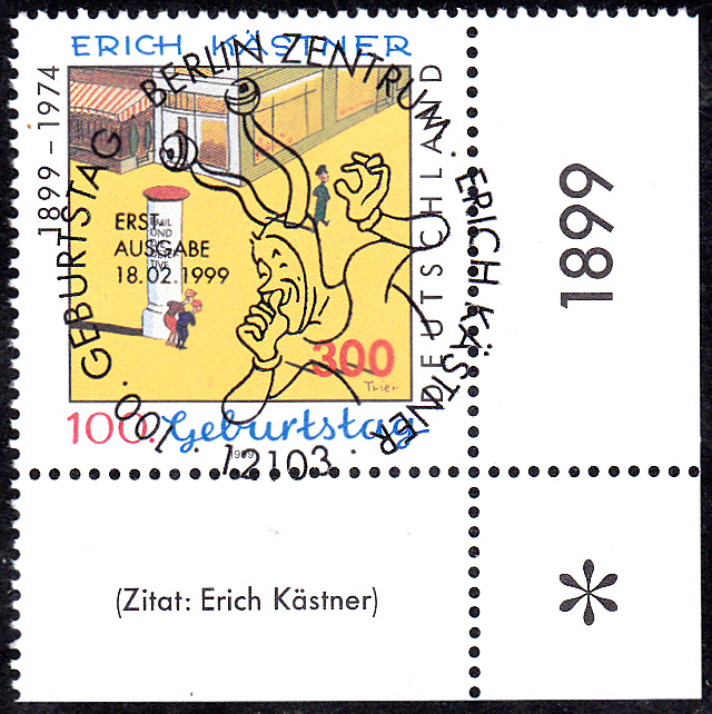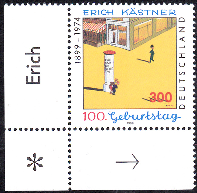 Zu seinem 100. Geburtstag erschien eine Marke (MiNr 2035) mit der Titelillustration von Walter Trier zu "Emil und die Detektive". Hier eine Marke als Eckrandstück.