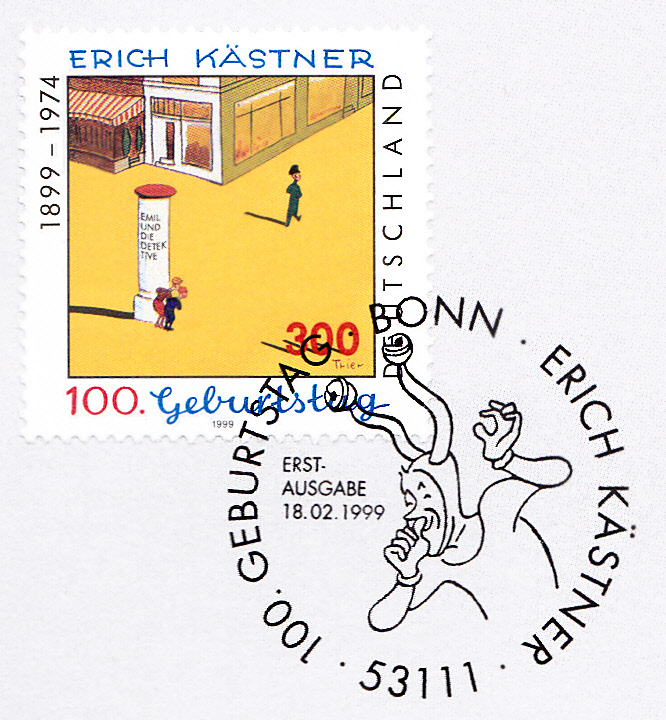 Hier ein Sonderstempel vom 29.7.2014 aus Bonn zu seinem 40. Todestag. Im Bild zu sehen sind eine Litfaßsäule mit dem Bildnis von Erich Kästner und Emil und die Detektive.